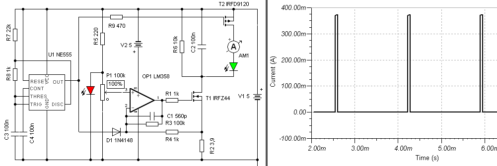 Alapvetően a diódával is megoldható a lekapcsolás. De amikor a szabályzó a tiltás után visszakapja a visszacsatolt jelet, kicsi lengés van az áramban. Ezért tettem bele a felső P-Fet-et. Az tulajdonképpen kapcsolja a Laser áramát, a dióda meg tiltja ez idő alatt a szabályozást. Így a szimulátor szerint viszonylag jól működik. (Amúgy hagy hatod az eredeti kapcsolásodat is. Az OPA feletti 5V-os táp csak azért szükséges, mert a TINA-ban nincs LR Fet ami 5V-ra működne. Pontosabban az IC kimentéről, maximum 3,6V érkezik, a 3,9ohm-on meg 400mA esetén 1,56V esik, így a GS feszültségnek már csak kb. 2V marad. Vagy is az LR is csisszesen jár. Betettem a Led-et is a potira, ami korlátozza a poti feszültségét. P-Fet-nek valami olyan kell, ami tud kapcsolni 5V feszültséggel. A freki jelenleg 400Hz körül van. De gondolom a lényeget ki tudod hámozni.) üdv!