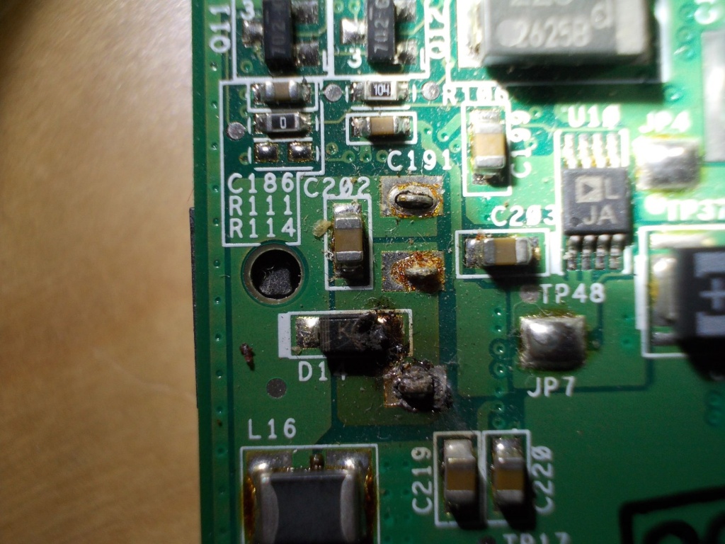 Ha tényleg gyanta, akkor viszont a D14 sorsát illetően nekem is az a hihető, hogy valaki az előző forrasztásnál "megkínálta" a pákával. Legalábbis tökre nem olyan alakja van, mintha önszántából pukkant volna el.