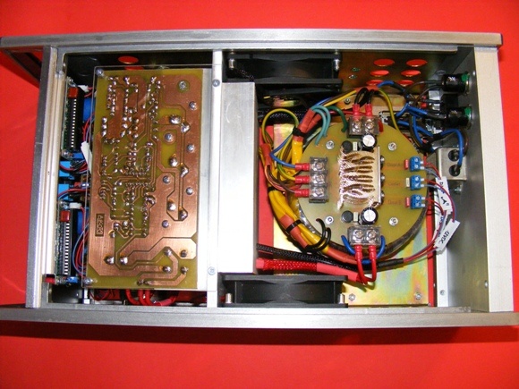 Nem ültettem a PCB-re az eredeti puffer kondit. Volt itthon másmilyen, inkább azt szereltem be. Valahol a kép közepén látszik a ventilátor elektronikája, amit, KIT- ként vásároltam a HE-STORE-ban. 45 °C-nál aktiválja a ventillátorokat. A dobozhoz kaptam egy vérvörös plexit. Ez adta az ötletet, hogy minden legyen mögötte, és a kijelzések csak aktív állapotban jelenjenek meg. Ezért lényeges az előlap fekete színe.