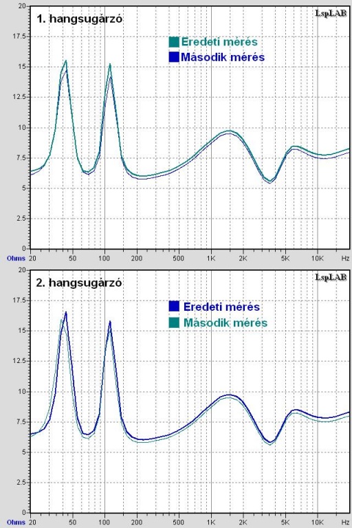 Mivel a hátsó 2 hangsugárzók 10 Ohm huzalellenállással együtt sorosan lettek bekötve, így ha történt károsodás, az eltérő mértékű kell hogy legyen. Egy példa: ha a táp rákerült egy pillanatra, akkor az első két hangsugárzó 2,5x nagyobb terhelést kapott volna DC-ben, ami azért eltérő mértékben károsította volna, szerintem. Azért a 4 impedacia görbe egymáson már mutat valamit