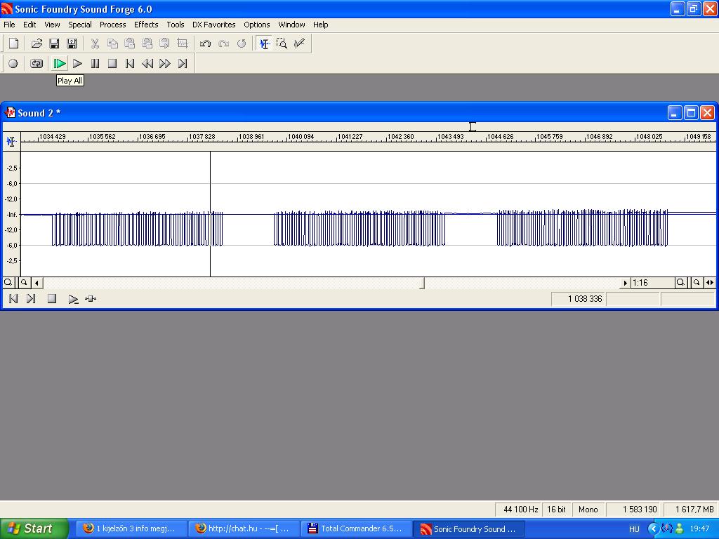 Nagyon egyszerű, adott ugye a veznélküli csengő vevőáramköre, erről leválasztottam a dekódert és belevezettem a HF erősítőbe, igy az csicsereg a hangszórón, ami a frekvencián van. Ezt teszem rá egy potis csillapítás után a PC vonal bemenetére. Raktam még bele egy 5V-os tápot és egy SN7414-es schmidt triggert, amivel a vevő jeleit négyszögesítem, igy szebb a kép...