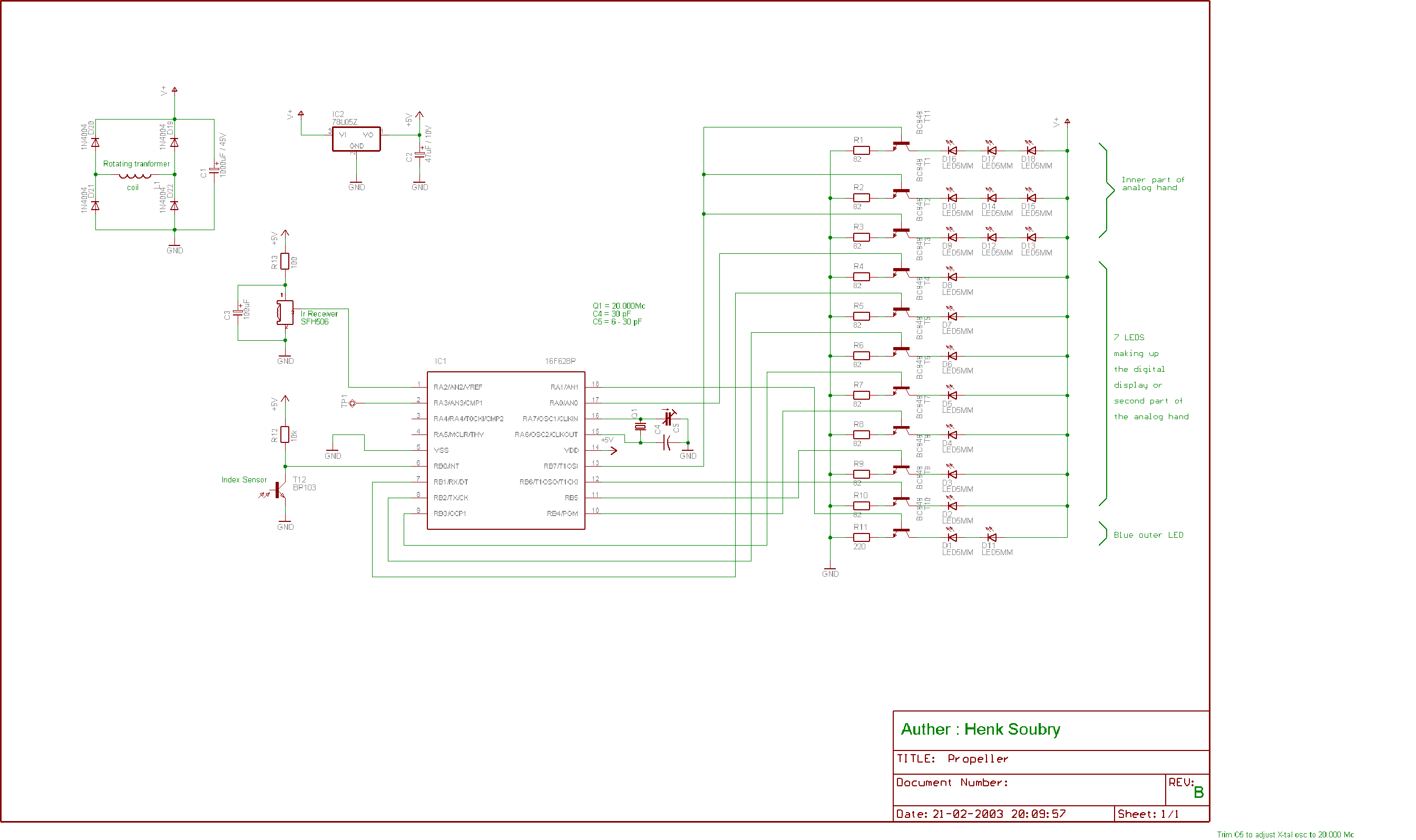 I'm trying to build a propeller clock - Soubry's type. I've made the base and the propeller. Only that LEDs are on - pic 0016. i've made the modification from this post: http://www.hobbielektronika.hu/forum/topic_post_296767.html#296767 and added a zener on C1. i don't know hungarian so i'll use google translate: Próbálok építeni egy propeller clock - Soubry típusát. Csináltam a bázis és a propeller. Csak az, hogy a LED-ek vannak - pic 0016 Csináltam módosítását tól ezt a bejegyzést: http://www.hobbielektronika.hu/forum/topic_post_296767.html#296767 és hozzátette, a zener dióda C1. így ez nem működik megfelelően. Van valami javaslatod?