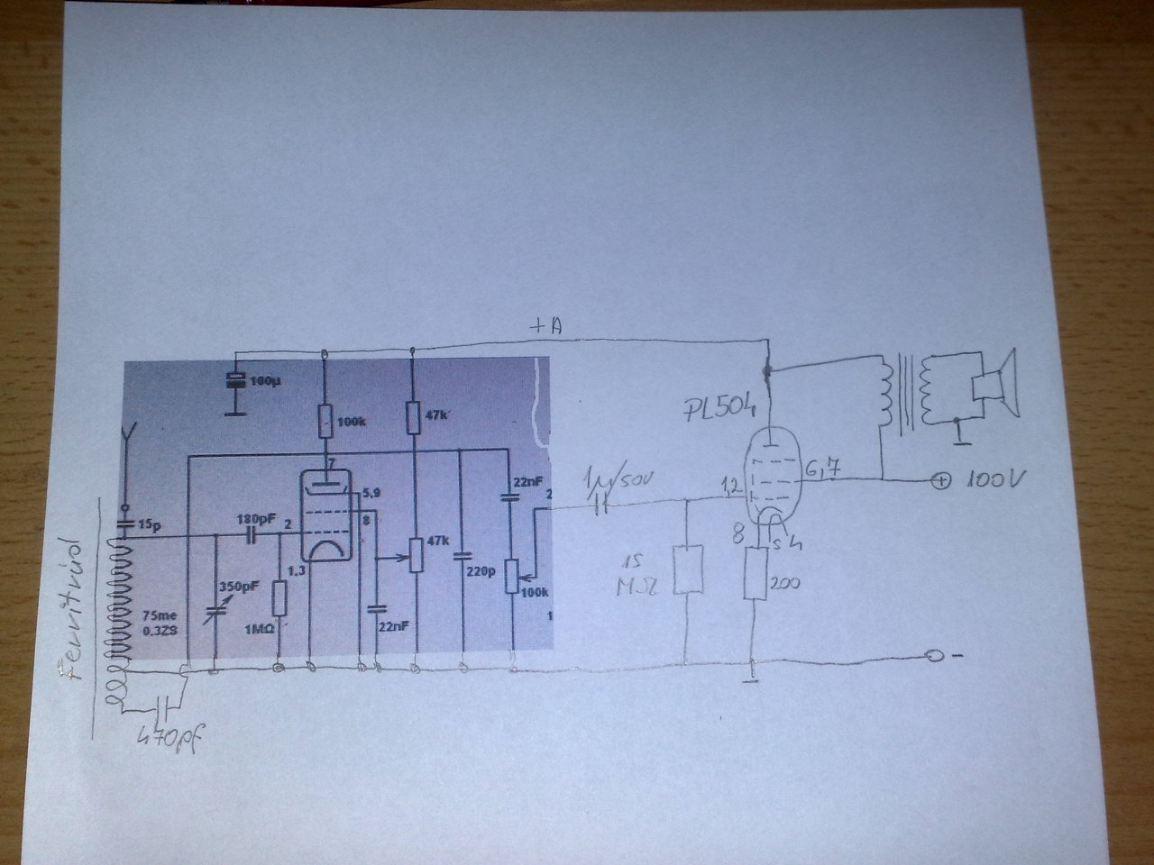 Összerajzoltam a rádiót az új végerősítővel. Ezt szeretném véleményeztetni veletek hogy jól van összerajzolva!Végerősítőnek egy PL504 es csövet tennék be, mert a fűtőárama mind a két csőnek 300mA Így sorosan tudom kapcsolni a fűtés az 33 volt lenne az anódfeszültséget pedig a feszültségnégyszerezővel elő tudnám állítani. Tisztelettel Madzagos