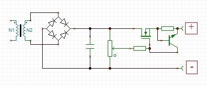 Az szerintem 0,5A-t sem tud, de talán megfelel. Nem tudok rajzolni mert nem a gépem előtt ülök, de megpróbálom elmagyarázni. Összekötöd a trafó két szekunderét sorba, így lesz 32V-od. Erre teszel egy kisebb graetz hidat, 1A-es is elég (ha nincs más talán a 4db 4148-ból épített is kibírja), majd teszel rá egy puffert (nem kell nagy 100-200µF/50V bőven elég). Ezen lesz terheléstől függően kb. 40-45V egyenfeszed. Erre párhuzamosan rákötsz egy 20-50k körüli potit, aminek a csúszkáját üresen hagyod. Ha most elkezded a potit tekergetni, akkor a csúszkán a negatívhoz képest 0 és 40-45V között tudod szabályozni a feszt. Fogsz egy fetet ami legalább 50V-os, ennek a drain-jét rákötöd a +45V-ra, a gate-jét pedig egy 10-22k-s ellenálláson keresztül a poti csúszkájára. Ezzel kész a 0-tól 40V-ig szabályozható tápod, amihez kell még egy áramkorlát. Fogsz egy BC (npn) tranyót meg egy 1-2 ohm körüli ellenállást, ez lesz a sönt. Az ellenállást sorba kötöd a FET drain-jével (ez lesz a táp kimenete), és rákötöd a BC-t is úgy, hogy a bázisa a FET drain-jén, az emittere az ellenállás másik végén (vagyis a kimeneten), a kollektora pedig a FET gate-jén legyen. A tranyó 0,6V körül nyit ki, tehát ha mondjuk 1,5 ohmos söntöt használtál, akkor 400mA-es lesz az áramkorlát, vagyis ennél több áram nem fog folyni a kimeneten rövidzár esetén sem.