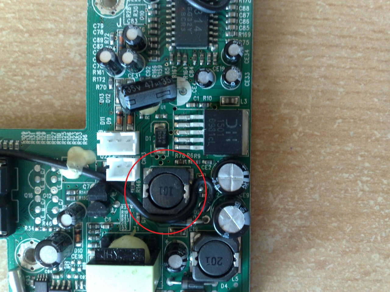 A 230V os oldalon az ic és a hütöborda közti két elektrolit kondenzátor cseréjével.