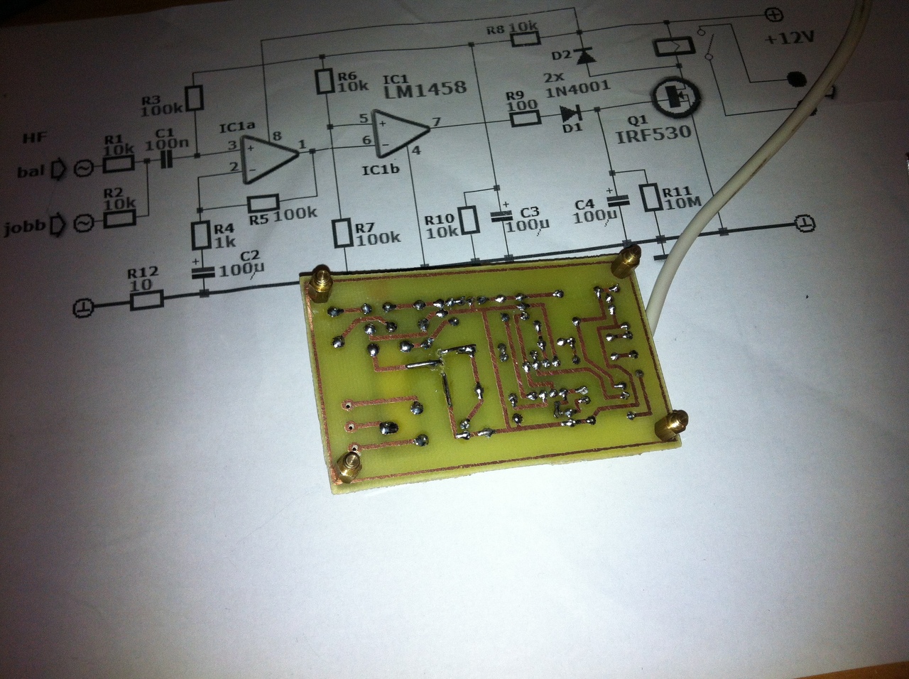 Sziasztok. Készítettem egy erősítőhöz való automatikus ki-be kapcsolót. Elsőre elég érdekes dolgot produkált, de kiderült, hogy hibás volt a kapcsoló Fet, köszönet Reloop-nak a hibakereséshez. Most már szépen működik.