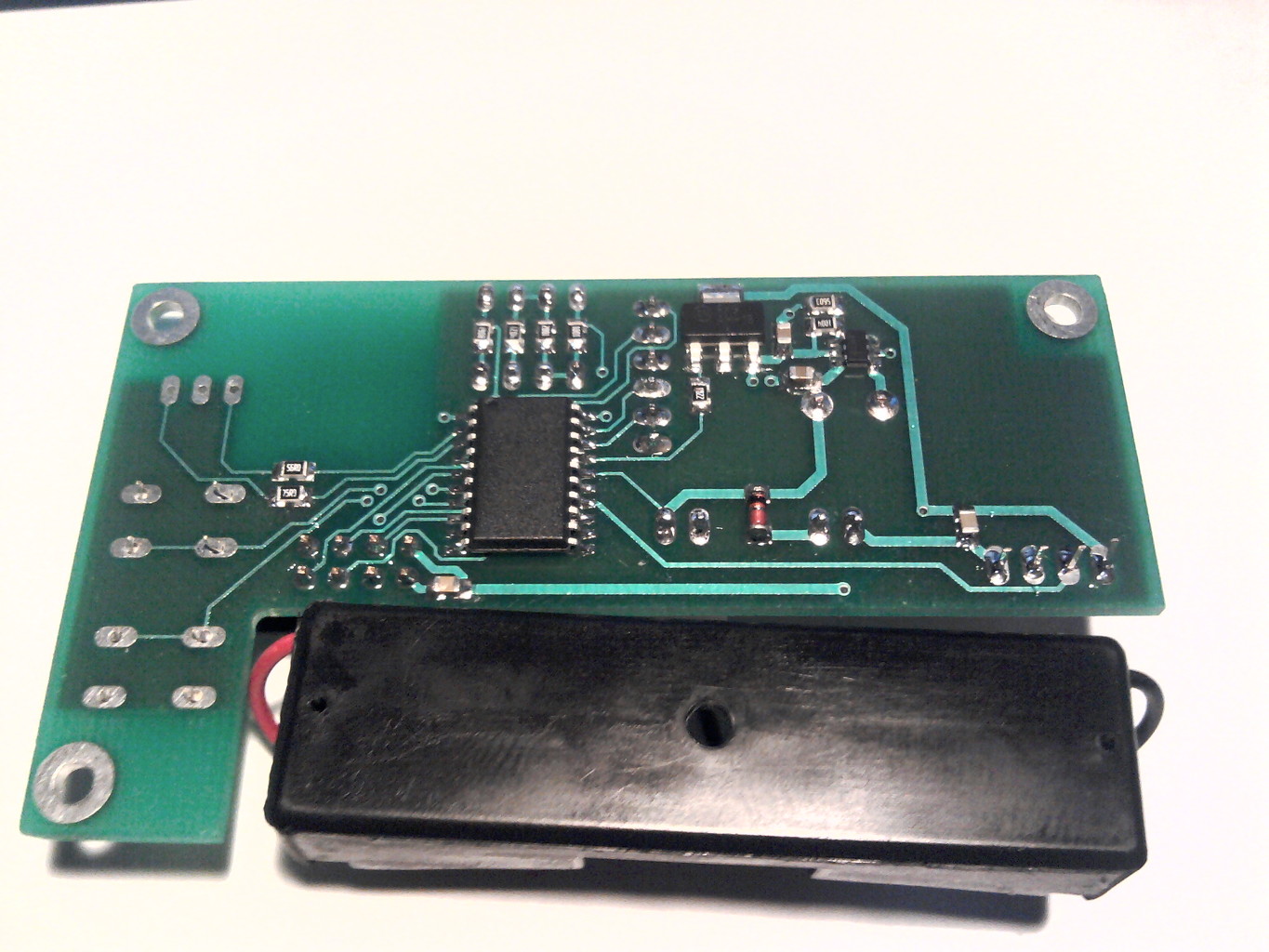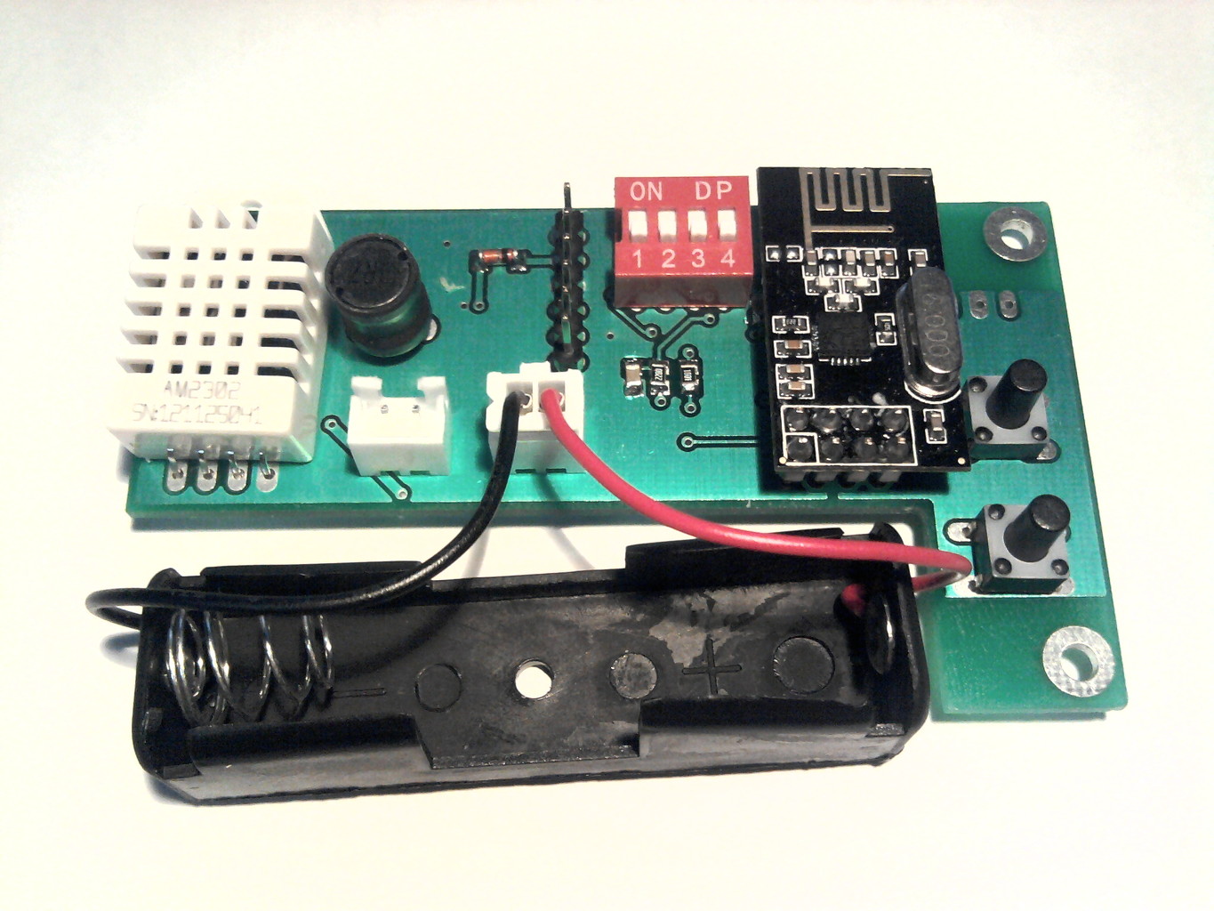 Egy nagyobb projekt első része, egy vezeték nélküli hőmérséklet és páratartalom érzékelő. Akksis, napelemes táplálással. MCP1640 állítja elő a 3.3V-ot, az 1.2V-os akksiról. A napelem az akksit közvetlenül, egy diódán keresztül tölti. PIC18F14K22-n fut a szoftver. NRF24L01+ a vezetéknélküli modul. A forrasztás régi orosz pillanatpákával és 0.56mm-es forrasztóónnal történt.