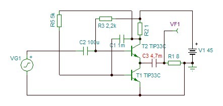 Az elrendezés megteszi nekünk azt a szívességet, hogy 1A nyugalmi áram mellett ad akkora kivezérelhetőséget, ami 2A mellett járna és mellékhatásként 10dB-el csökkenti az áramgenerátoros emitter követő torzítását. Tehát a kapcsolással olyan torzítást érhetünk el, amit egy sima emitter követővel soha és mindezt fele hőtermelés mellett...