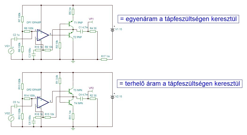 Az egykori csöves, A osztályú, kimenőtranszformátoros erősítőknek a felső ábra felel meg, jobban is szól annyival, mint az alsó variáció. Érdemes kipróbálni, mennyit javul a hang attól, ha a kimeneti áramnak nem kell átfolynia a tápegység pufferén és dióda hídján.