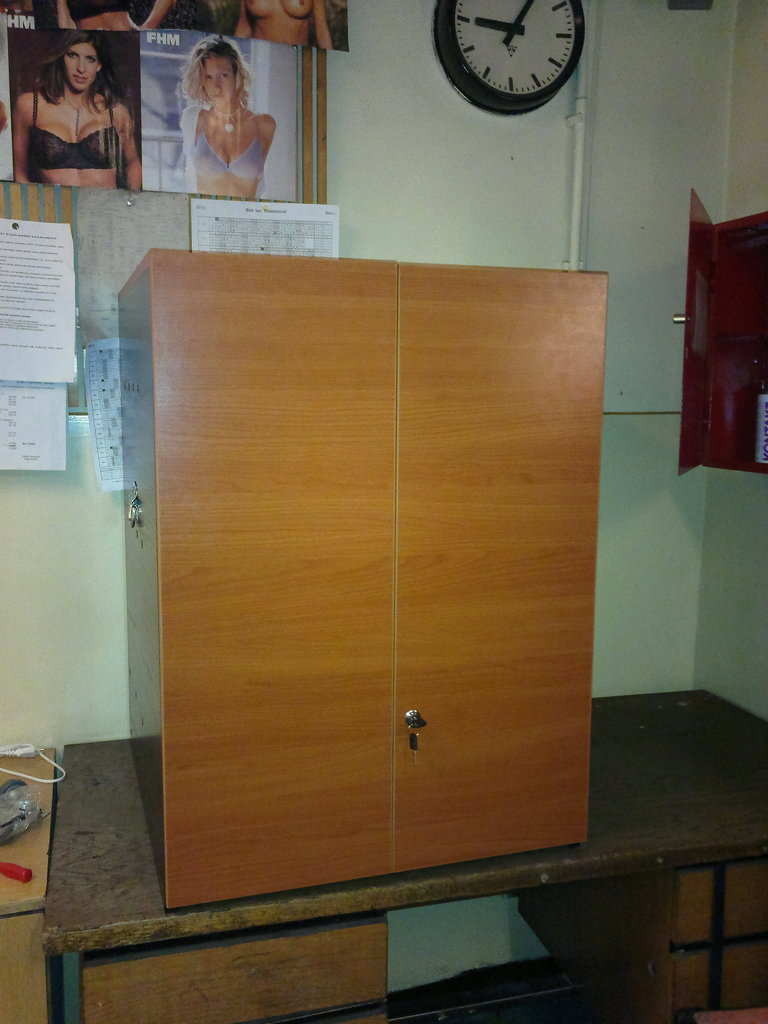 A munkahelyemre készült mert elegem lett belőle hogy a szerszámaim az egyik szekrény egyik fiókjában vannak, a műszereim a másik helyiség egyik szekrényében, az alkatrészek meg egy harmadik szekrényben stb. Mindig elő kellett szedegetnem őket innen-onnan. Mostmár nincs ilyen gond mert egyben van az egész. Még csak a fotókon látható fa része van kész, de lesz egy fém alja is négy kerékkel, hogy tologatni lehessen. Így mikor jön a váltás akkor nem kell eszeveszett pakolásba kezdeni hanem egyszeűen csak becsukom az ajtajait és betolom a helyiség sarkába hogy ne zavarjon senkit. Ráadásul mivel gurul így ha esetleg átkerülök másik szolgálati helyre akkor csak begurítom egy metróba (a metrónál dolgozom) és kigurítom a másik állomáson.