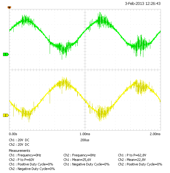 Átállítottam a kapcsolsái frekvenciát 200kHz-re a visszacsatolással. A kimeneti szűrő végén (BD moduláció) kb 3,2Vp-p jel látható (kb 1V eff). A félhídon még vannak szép tullövések, de megpróbálok majd jobban szkópolni, mert az is lehet, hogy mérési hiba.