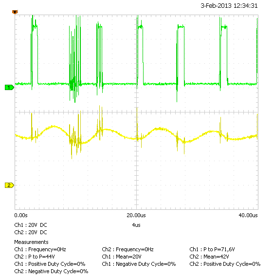 Van egy Velleman HPS10-es szkópom, ami a BTL-re van rárakva (földfüggetlen a szkóp), és ott semmilyen tüskét nem látok (jó ennek 2MHz az analóg sávszélessége) Most gyűjtök egy új szkópra, ami várhatóan egy Textronix TDS3012B lesz. (tudom drága, de ez lesz az utolsó szkópom, és több nem lesz...) Most semmilyen RC snubber nincs, de van egy 1µF fólida kondi, aminek a lábait pont ráraktam a felső FET D-re és az alsó FET S-re. Majd tervezek RC snubbert is, illetve optimalizálom a meghajtást. De azt majd csak a követező nyákterven.