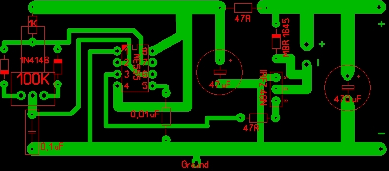 - Ha az 555-öt elforgatod balra 90 fokkal, egyszerűsödik a rajzolat. - A stabilizátor kimenetére egy 10..47µF-os elkót és egy 100nF-os kondit is illik tenni. Lehetőleg közel a stabihoz, és az IC táplábaihoz. Mert mind kettőnek szüksége lenne rá. De semmi esetre sem így ahogy most van, mert a kondi jelenleg csak zárlatban van. üdv! proli007