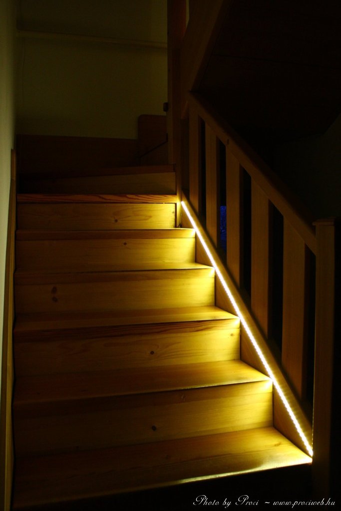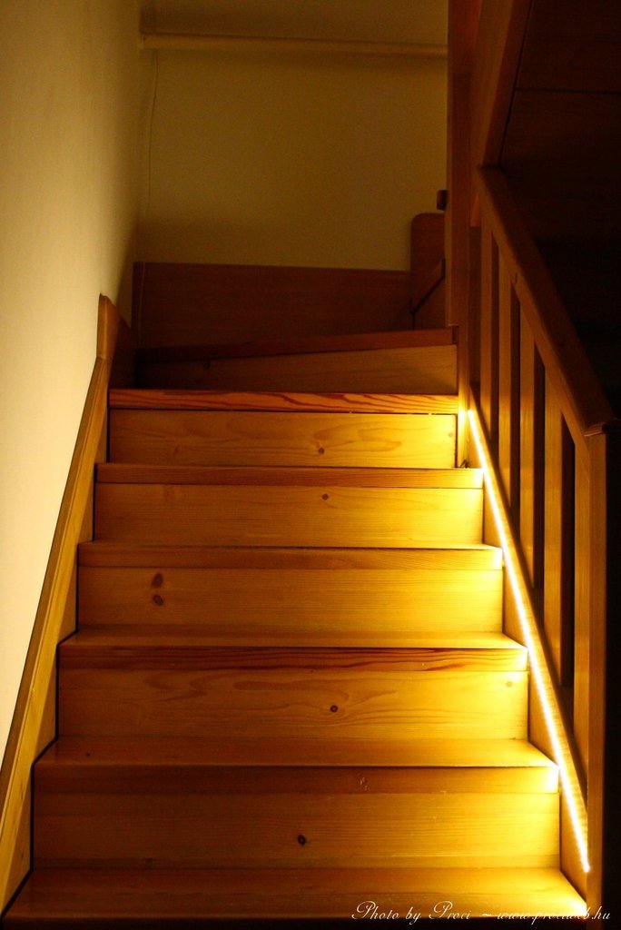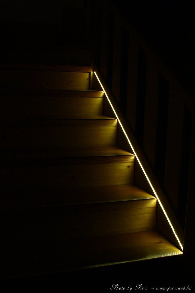 Karácsonyra készítettem el ezt a kis hangulatvilágítást. 4.5m vízálló LED szalag lett felhasználva. 2A-es DC-DC konverterrel bármilyen fényerőre leszabályozhatom az egyébként ~1.5A-t fogyasztó LED szalagot. A lépcsőfordulónál egy PIR mozgásérzékelő van, mozgásra felkapcsol és egy meghatározott ideig még világít mozgás után (555 timer IC). Egy mikrokapcsolóval fix-re is lehet kapcsolni, ha nagy a jövés-menés. Ünnepek alatt általában fixen volt hagyva. Egyébként éjszakai irányfénynek lett építve, mert nem akarjuk felkapcsolni a nagy villanyt. Így szépen végigvilágítja a lépcsőfokokat, ha este letotyogunk ![]() A képek teljes sötétségben készültek. A hozzászólás módosítva: Feb 3, 2013