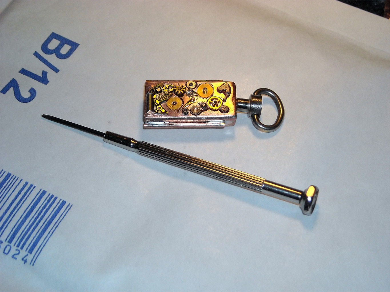 Régi órákat használtam fel. A tokot én forrasztgattam rézlemezből. Az akasztója egy vekker felhúzója. A kulcs tibeti ezüst fityegő, átalakítva.