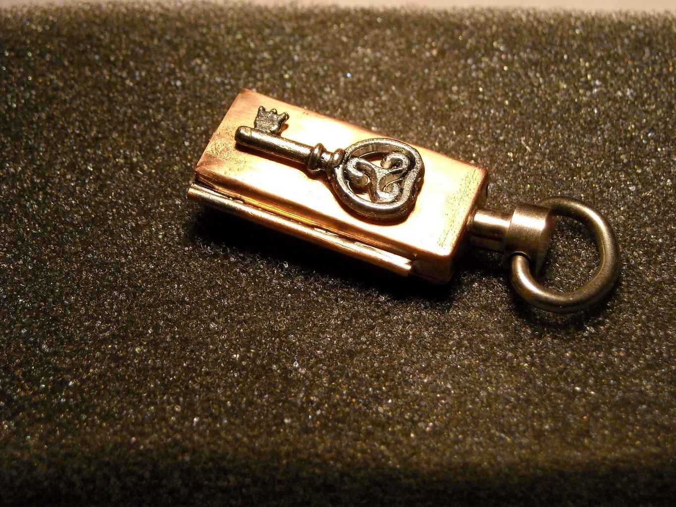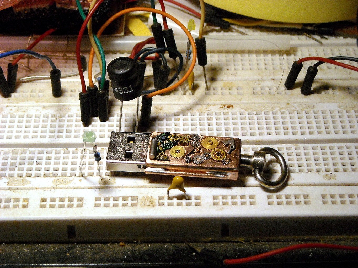 Nem annyira elektronika, de van benne az is. Mechanikai szárnypróbálgatás pákával, forrasztó ceruzával, steampunk stílusban. Egy 16GB-os mini pendrive csusszan bele.