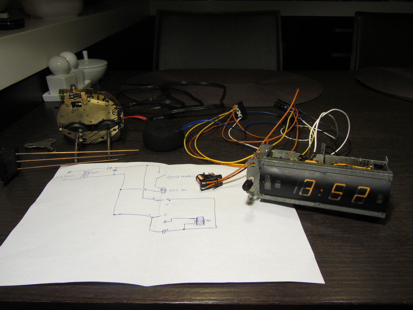 még nem akartam felrakni hiszen nincs befejezve, de vicsys stempunk pendrive-ja felbátorított... Szóval... a múltkori börzén vettem 800 ft-ért egy 10V AC-ről üzemelő műanyag fogaskerék rendszerű elektromotoros órát. Valami japán csodából lett kitermelve. Az elve nem a megszokott hengrekre festett számjegy alapú, hanem áltatam még sosem látott hétszegmenses-re gyönyörű tipográfiával kimaszkolt előlap mögött kriksz-kraksz mintázatú hengerek adják ki a számjegyeket. 10 perces léptékben ébresztés is beállítható rajta ami egy 1 áramkörös mikrokapcsoló bekapcsolásával valósul meg. Ezt kihasználva megterveztem hozzá egy félvezető mentes monostabil multivivibrátort ahol a egy feltöltött elkó állítja be a behúzás idejét ami egy elektromágnesen keresztül a háttérben lévő 1954-es kalapácsos rendszerű mechanikus órát hoz működésbe. Elveimet feladva egy pici toroidra tekertem utp kábelből 10,5V-ot ami az egészet működteti... üdv. A hozzászólás módosítva: Feb 3, 2013