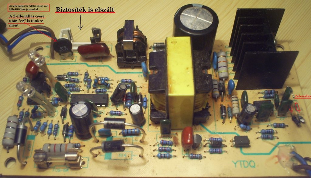 Sikerült tönkretennem a töltőt is.. ![]() Fordított tápot adtam neki, vagyis a töltendő akkut kötöttem rá véletlenül fordítva a töltőre. Nem történt semmi pukkanás, csupán a LED villog folyamatos ütemben, és természetesen kimenő feszkó sincs.. A "szekunder" oldalon kicserélek majd mindent, az LM324-et már kicseréltem, a hiba ugyanaz. A diódákat gondoltam, hogy nem kell kicserélni, mert a fordított táp nem jut rajtuk keresztül, és az összes dióda jó is a szekundernél, de azért kicserélem azokat is. Bővebben: Link Ezt a fotót az egyik látogató töltötte fel régebben, és az engedélye nélkül felhasználnám itt.. ![]() Látható a kép jobb alsó sarkában a "YTDQ" felírat, fölötte pedig egy 4 lábú kis mütyür. Ez pontosan micsoda?(a 4 lábú kis mütyür) A visszacsatoló lehet, mert az lm324 outputja ezen keresztül vezérli a primer oldalon lévő kapcsoló üzemű ict, amit kicserélek, és a fetet, amit úgyszintén, de erről a 4 lábú jószágról nincs infóm.. :/ Köszi előre is. Tomi