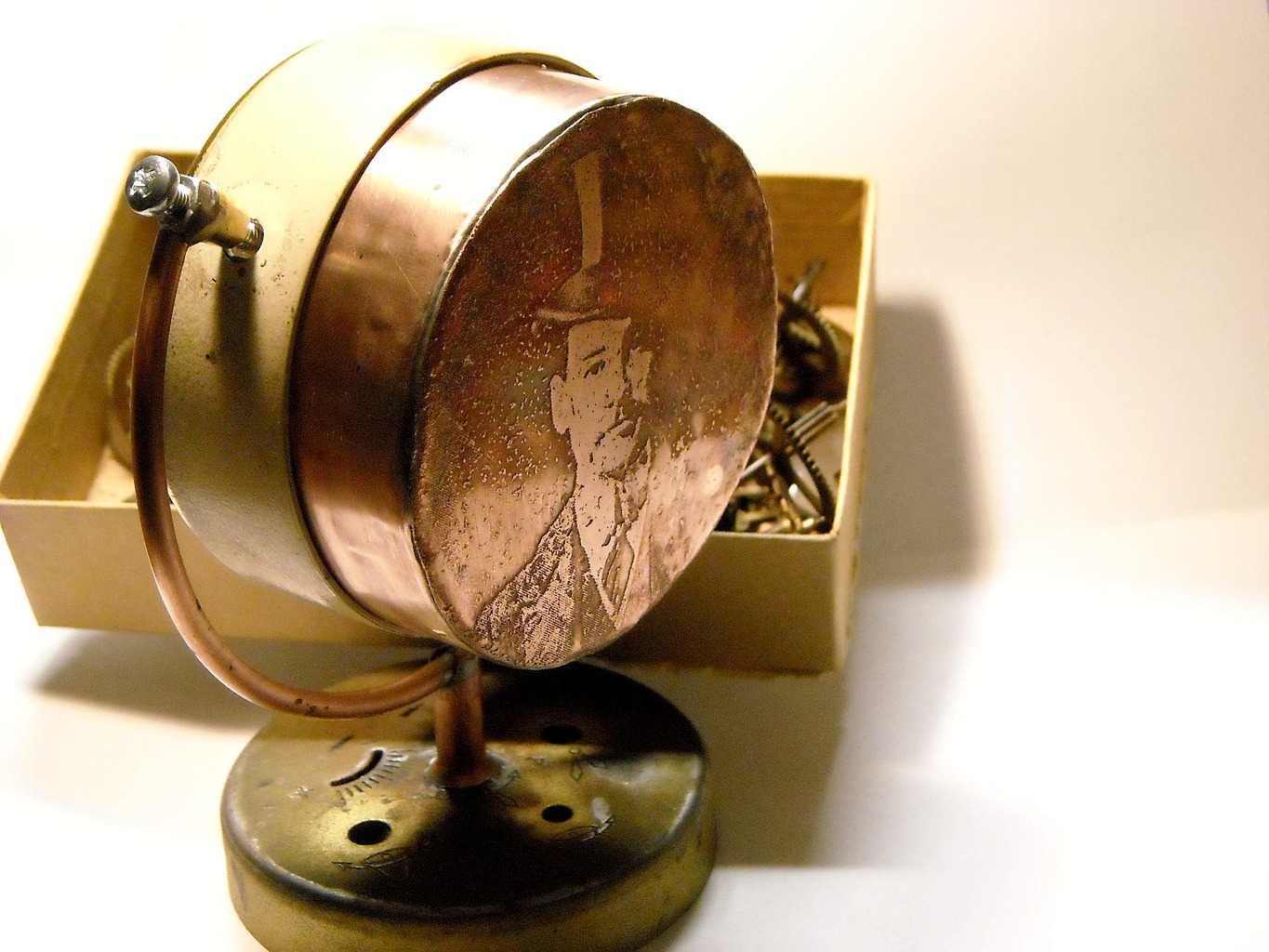 @ Köbi! Helyesen: óránk. Én csinálom, Te pedig nézed. ![]() @Doncso! Marattam, mint a nyákot. Az üres rézlemezt elöl P20-al, hátul fekete festékkel fújtam le. Egy régi fotót világítottam le rá és előhívás után marattam. @Zolika60! A csavarok természetesen cserélve lesznek, valami szép bronzcsavarra. Most csak ideiglenesen tettem bele, a kép kedvéért.
