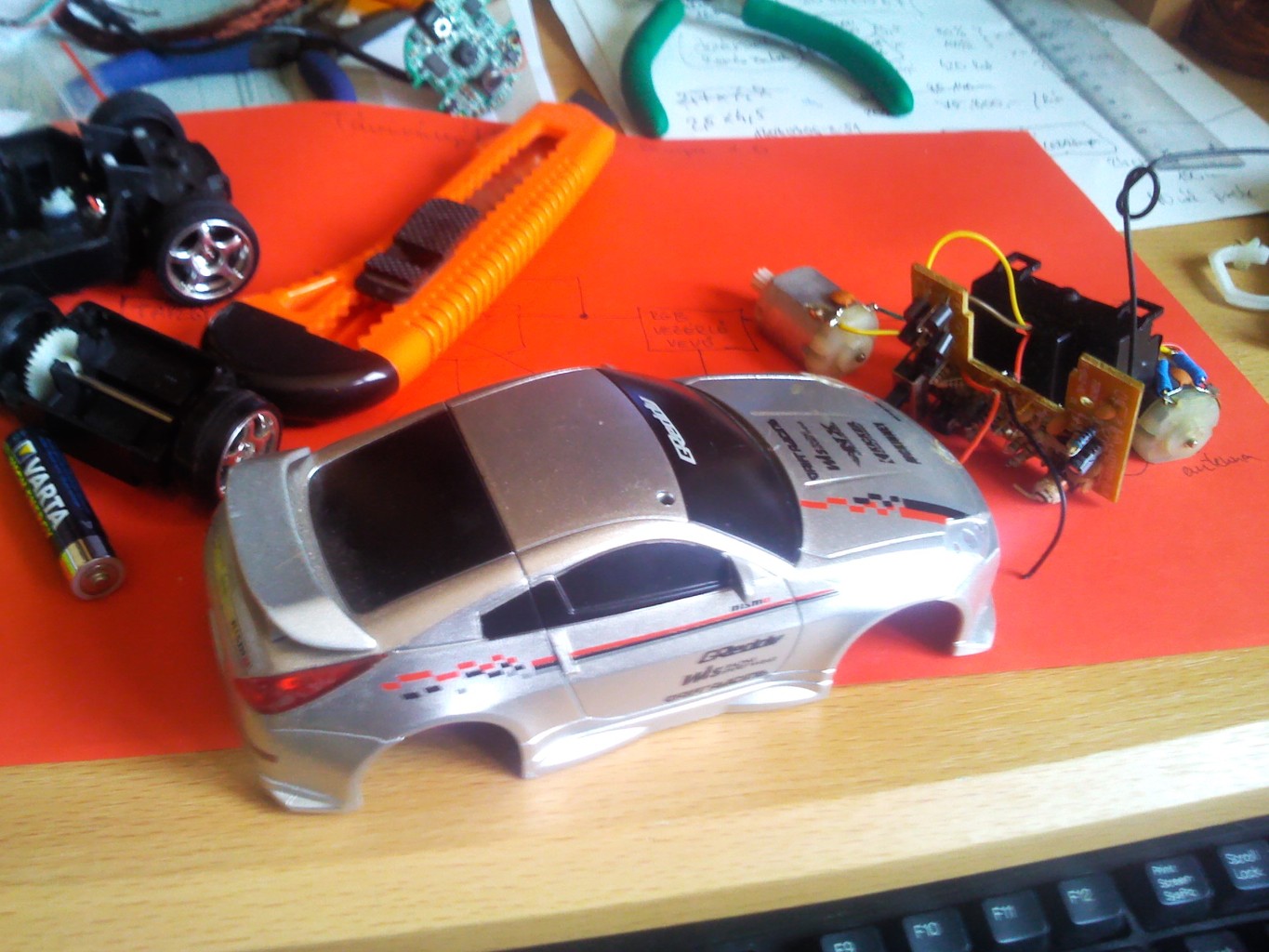 Ezt nem én építettem, hanem bontottam egy gyermekkori játékomból, amit már vagy 10 éve nem használtam. Gondoltam jó lehet valamire. 40 megás egység két motorral. Szerintem semmi PWM meg ilyenek, egyszerűen csak jelre feszültséget kapcsol a motorokra. LED-el kipróbáltam, így tudok LED-et távirányítóval kapcsolgatni. Mi legyen belőle?