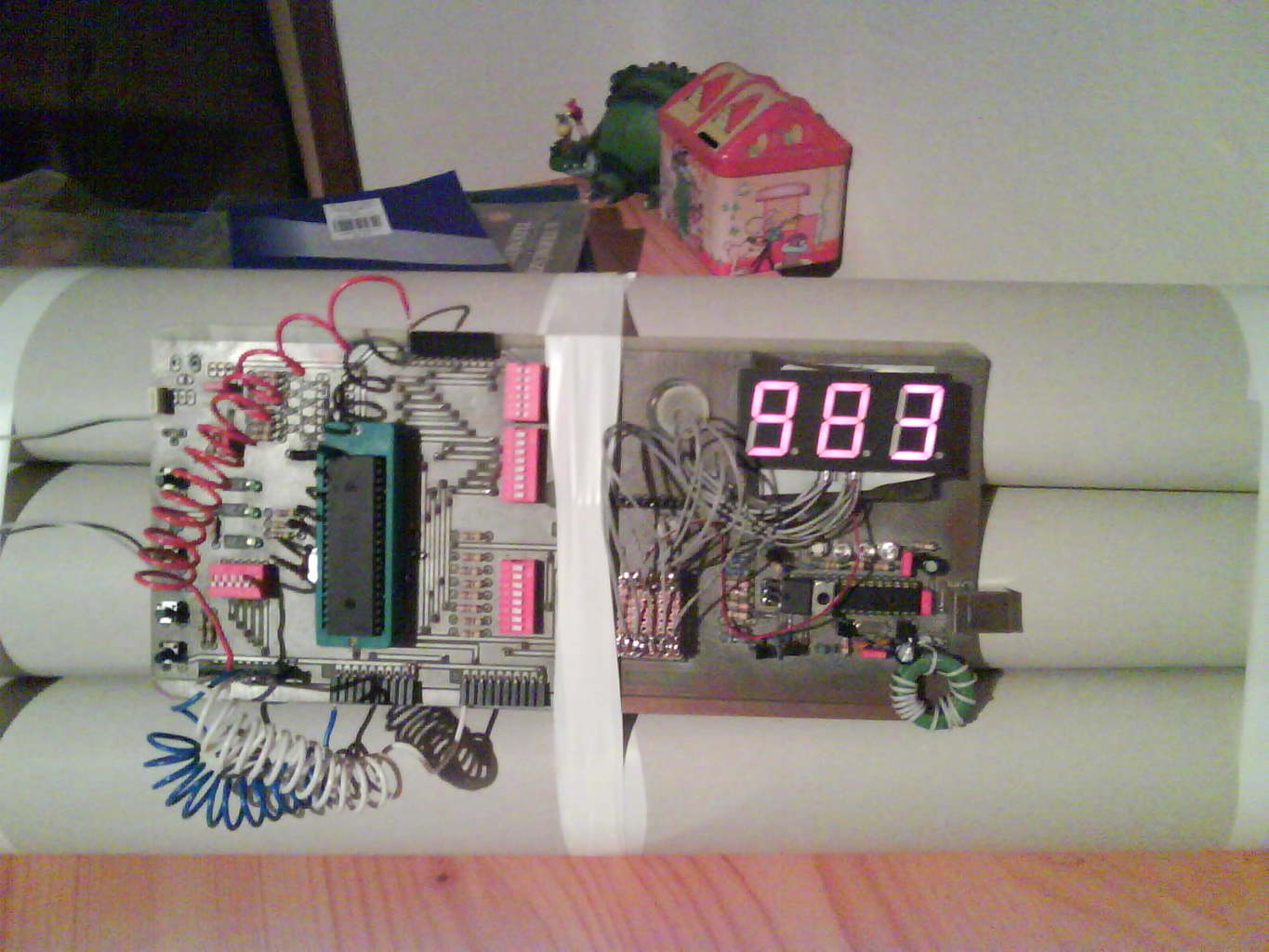 Farsangra készült ez a "bomba" az időzítő 999től számol visszafelé , ha a fehér drótot vágja a "bombaszakértő" a számlálás begyorsul , ha a pirosat is elvágja akkor már nagyon gyors a számlálás , és a kék vezeték vágása hatástalanít.Egyenlőre a dinamit rudak kartonból vannak ezeket majd festett csőre cserélem a hétvégén .