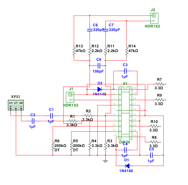 Itt van a bemeneti rész kapcsolása, kicsit kusza elismeresem. A 6 és 7 láb a komparátor bemenetei. A 3,3 ohm ellenállások mennek a FETek gatejáre. Felül a J2 csatlakozó az a kimenetről jön. Jól látható a visszacatolsá RRC köre, ami a fázistoló tag.