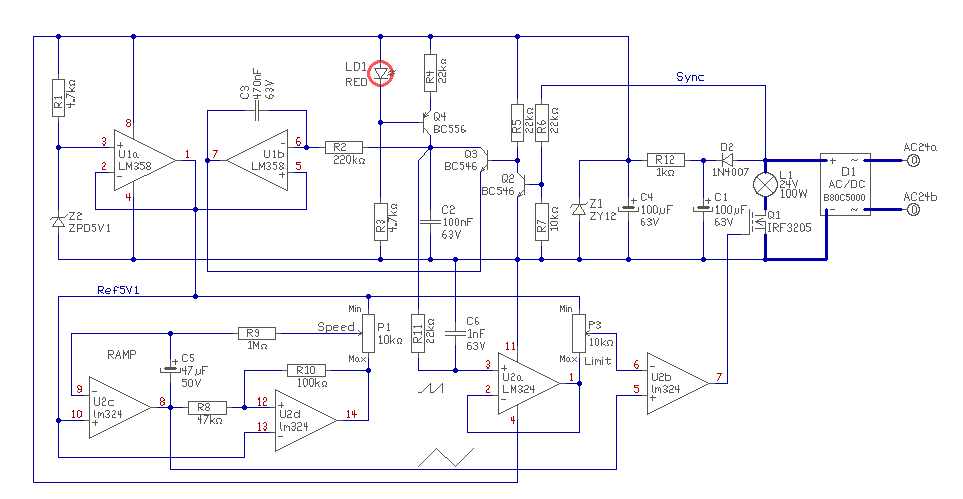 - Értem, akkor az izzó bekötések adottak. - Nem a primeroldali fázishasításra gondoltam, hanem magára a vezérlésre. Nos megrajzoltam. Lehet kissé komplikáltnak találod, de nem akartam cél IC-t használni, mert általában az nincs. Kicsit leírom, hogy működik. Mert néhány érdekességet is tartalmaz. - Az R1/Z1/U1a állítja elő az IC-k munkapontjához szükséges feszültséget. Azért van az IC-vel "megtámogatva a zéner, hogy terhelhető legyen minden irányba (meg volt egy felesleges OPA is) Ennek kimeneti feszültsége 5,1V. Azért ennyi, mert 12V tápfesz mellett, az LM kimenete kb. 0..10V között változik, így 5V körüli munkapontra szimmetrikus a kimenet változása. - Az alapműködés az, hogy egy 100Hz-es "háromszögjelet" és a RAMP jelet bevisszük az U2b komparátorba. Annak kimenetén előáll a PWM jel, aminek kitöltése a RAMP pillanatnyi feszültségével lesz azonos. Ha a két feszültség csúcsértéke egyenlő, akkor a Ramp, 0..100%-ig fogja vezérelni a jelet. Ha a Ramp nagyobb mint a fűrészjel, akkor "túl fogja vezérelni" a komparátort. De mivel, 0 és 100%-nál nem lehet több a PWM, úgy tűnik, mint ha addig állna 0-án és 100%-on. ezért szabályozzuk a háromszög jelet P3-al. (Nullára nem illik egyik potiti sem vinni!) - A háromszög jel előállításának két kritériuma van. Legyen szinkronban a hálózattal, valamint a középértéke egyezzen meg a munkaponttal. (Mert a RMP is ehhez képest értelmezhető.) LD1/R3/R4/Q4 egy áramgenerátort alkot. Q4 kollektorárama tölti a C2 kondi. Így a C2-őn a feszültség lineárisan növekszik. Ez lesz a háromszög felfutó éle. - A szinkronizációt az biztosítja, hogy a szinusz minden nullátmeneténél kisütjük a kondit. A D1 egyenirányító után kétutas egyenirányított jel van. Így ennek R5/R7 által leosztott feszültségét kapja Q2. A tranzisztor a 10ms-os félperiódus alatt nyitva van, kivétel mikor a bázis feszültsége kisebb mint 600mV. Ez csak a nullpont környezetében igaz, Így Q2 kb. 1ms ideig van zárva a nullpont körül. Mikor Q2 lezár, Q3 kinyit és kisüti a C2 kondit. Mikor vége a nullpontnak, a Q3 ismét lezár és töltődik a C2. - U1b OPA összehasonlítja a referencia feszültséget a háromszögjel átlagával (középértékével). És addig változtatja a kisütő tranzisztor emitter feszültségét, míg a háromszögjel integrált értéke meg nem egyezik a refrencia értékével. Így a fűrészjel, amplitúdójától függetlenül mindig szimmetrikus a referenciára. -