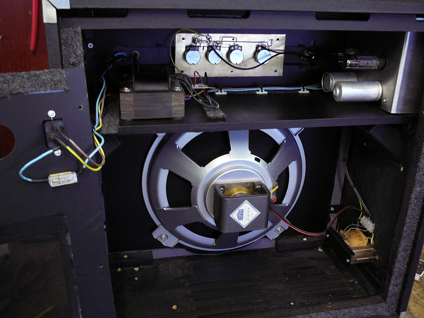 A doboz egy régi TV-ből készült ,a trafók egy régi rádióban öregedtek.A hangszóró egy kb 20 éves nagyérzékenységű /103dB/ Isophon PT 30/31A gitárhangszóró amihez nagyon jó áron jutottam hozzá. Több képet