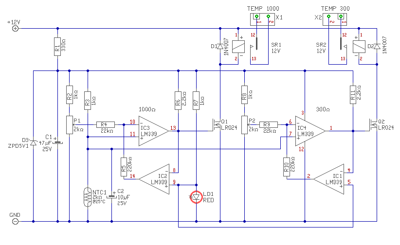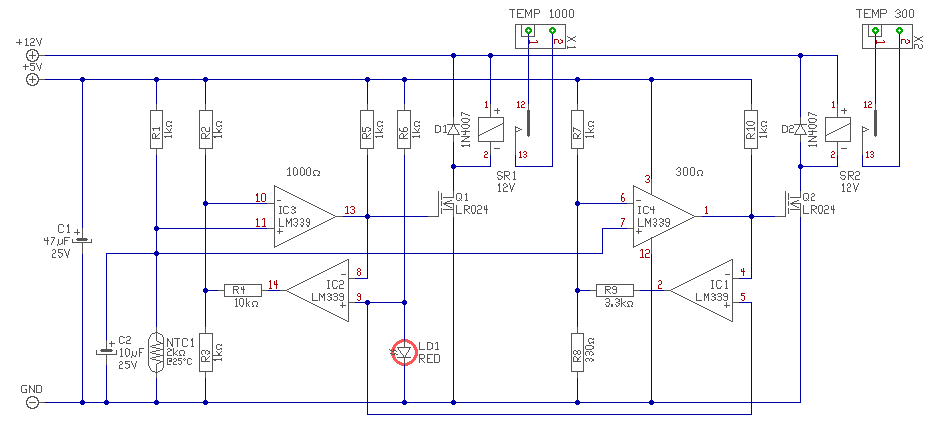 Na akkor sokadik átírásra. Kell egy segédáramkör ami kapcsolna 2 teljesítményrelét (persze ezek kapcsolnák az izzítógyertyákat) ami kb darabonként 500mA-t vesz fel. Azt kéne, hogy 50fok alatt mindkettő relé megy, 50 és 70fok között 1 relé, 70fok felett mindkettő kikapcsoljon, majd kimérjük hány fokon menyi az ellenállása és leírom, mert eddig jutottunk és így beszéltük meg és majd egy külön kisebb hőgomba lesz betéve és esetleg, hogy megoldható lenne-e, hogy változtatható legyen én arra gondoltam, hogy sorba rakni az NTC-vel (hőgomba) egy kis trimmer potit. 5V-ot felejtettük mert nem akarjuk terhelni a motorvezérlőt. Az eddigi segítségeket pedig nagyon köszönöm. És a rajzot is köszönöm szépen.
