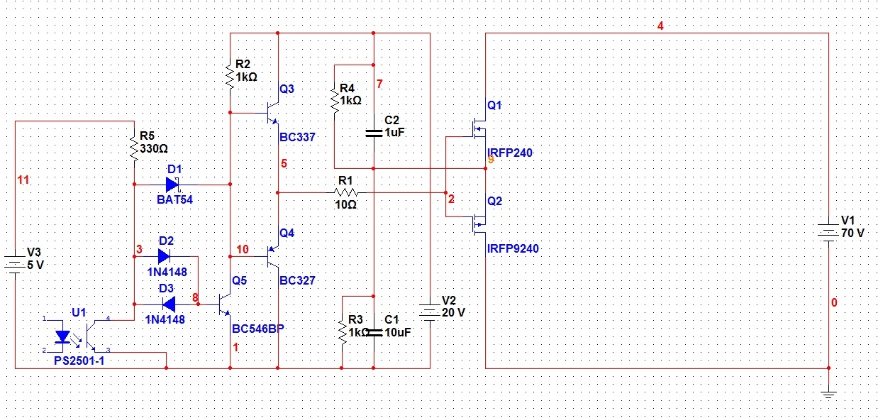 Ilyen "egyedi" erősítőm nekem is van egy, a mai napig működik. A poén hogy még szkópom sem volt amikor csináltam. Kettő ilyen van hídba kötve mint a képen, az optók 6n137ek, 7805 adja nekik az 5 voltot. Komparátorokkal és opampokal csináltam elé BD modulátort. Nem hallatszott semmi zavaró a hangján pedig biztos torzít mint a fene. Nem emlékszem pontosan, de olyan 50kHz körül mehetett.