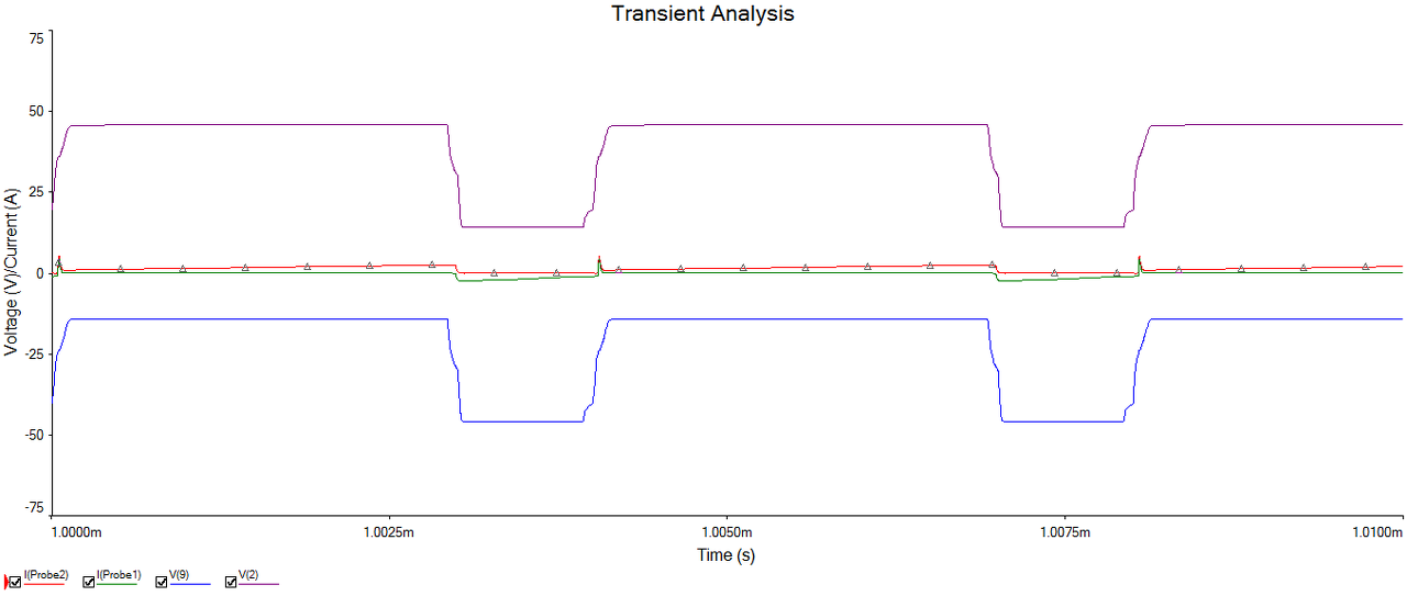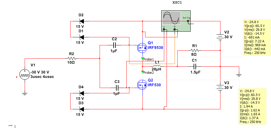 Idézet: „A gyakorlatból tehát nem tudhatják.” Pont azért vagyunk PWM-ben gyakorlottabak, mert bizonyos dolgokat már szimuláció alapján tudunk, valamiket meg egyszerűen fejben ránézésre a kapcsolás alapján. Idézet: „A komplex terhelést sem értem, mitől tenné tönkre az eszközt.” Ugyanaz, ami a bus pumpingot okozza. Az ide-oda áramló energiák dobálni fogják a tápot, és mivel nincs PSRR ezért ez hibát okoz. Idézet: „Ennél sokkal nagyobb baj az, hogy kapcsolási zaj keletkezik a hallható sávban” Az lenne az egésznek az előnye, hogy kisebb a zaj. Ha zajt látsz, akkor a kapcsolás előnye nem érvényesül. Persze mert a dióda reverse recovery durván termeli a zajt. És a privátodra válaszolva (nem modnom el mi volt benne), gyorsan leszimuláltam a dolgot (én Multisim 12-öt használok), és én látok reverse recoveryt, és amit mondtál szeritnem még mindig nem szünteti meg a reverse recoveryt. Persze a szimulációm egyszerűsített, de a MOSFET modell benne van, és az is túl optimista. (mert van ugyebár a lábnak az induktivitása ott a nyákterv okozta hibák satöbbi...) Megjegyezném, az általam használt 100V-os N-FETeknél Qrrt<100nC, és ezeket 200ft alatt veszem. (több mint egy nagyságrenddel kisebb a Qrr) Idézet: „a terhelés felől mégis áramgenerátornak látszik a kimenet” Csatolj vissza söntről. Vagy vegyesen, feszültség és áram visszacsatolás. Ismert dolog, és így teljesen tetszőleges damping factort tudsz beállítani.