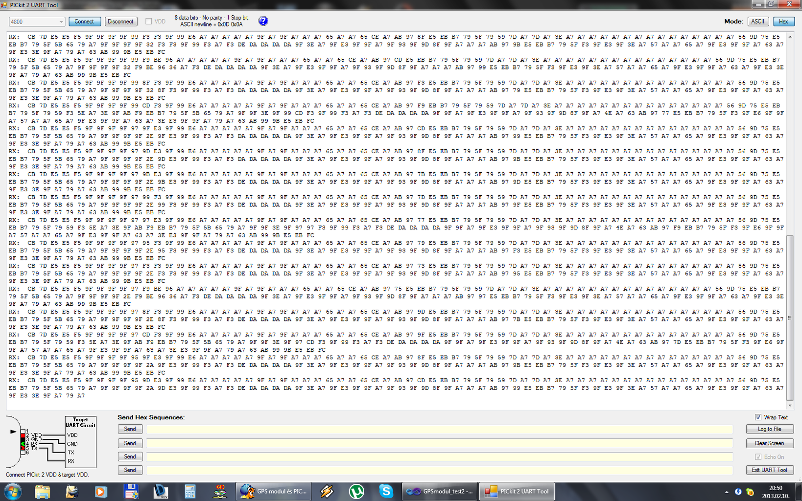Köszönöm a válaszodat neked is és a többieknek is. Egyenlőre PIC nélkül szeretném a soros adatokat kiolvasni a GPS-ből. Kipróbáltam, hogy közvetlenül olvasom a GPS-ből az adatokat a számítógépre a PICkit2-es égetővel. De közvetlenül nem megy, csak egy 100nF-os kondin keresztül. Írtad, hogy nem kell kondi, de nem találom, hogy miért nem megy a GPS-em (kondi nélkül). Kondival az alábbi adatok jönnek, már kezd hasonlítani egy kicsit a valósághoz. Mit próbáljak még meg, hogy olvasni tudjam az adatokat? Köszönöm a segítséget előre is! Üdv.