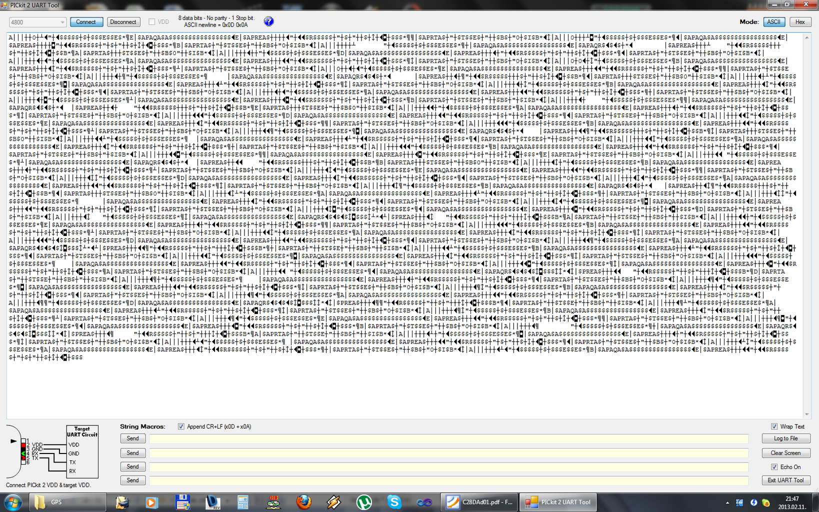 Remélem valaki még látogatja a fórumot! Következő problémába ütköztem. Egy GPS-PA6B vevőm van, amit szeretnék egy PIC18F4550-eshez illeszteni. Ez tud kommunikálni USB-én és soros porton keresztül. Az USB-s adat kommunikációt már kipróbáltam és azzal nincsen semmi gondom. A soros adat kommunikációt nem tudom rendesen életre kelteni. A vevő egységből érkező soros adatokat egy 100nF-os kondin (leválasztás miatt raktam be, mert a MAX232 beterhelte a vevőmet) keresztül egy MAX232-vel illesztem (a fentiekben olvastam a jelszint problémákról). A beérkező adatokat a PICkit2-es égetővel szeretném beolvasni a számítógépbe. A vevőtől érkeznek az adatok a gépre, de nem értelmezhetők (lásd a képen). Arra gondoltam, hogy a MAX232 negálja a rajta keresztül menő jeleket, de visszaszámoltam pár kapott értéket és nem kaptam értelmes eredményt. Most próbálom megfordítani a jelet, de úgy látom nem fog megfelelő érték érkezni számomra. A másik észrevételem, hogy az átviteli sebességet változtatom, akkor változnak a karakterek is. Az érkező adat csomagoknak az eleje hasonló szokott lenni, mindegyik egy "$" (dec-36, 24h) jellel kezdődik. Helyette nekem CBh-vel kezdődik az adatcsomag, aminek a negáltja 34h lesz és az nem más, mint a "4"-es karakter. Remélem elég érthetően körül írtam a problémámat. Remélem tud valaki nekem segíteni. Mellékelten csatolom a GPS-PA6B leírását. Mielőbbi válaszotokat előre is köszönöm! Üdv.