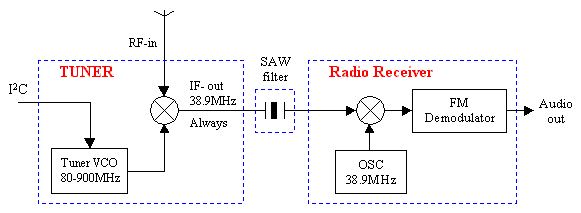 Kell egy szélessávú digitális tuner, 38,9 MHz-re egy keskenysávú fm vevő, egy PIC-es vezérlés