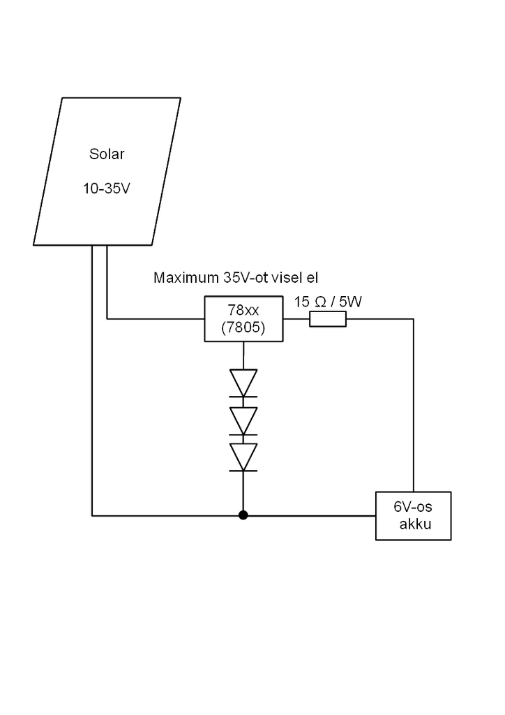 Nem baj, ha nem vagy profi, de ez általános iskolai alap... Ohm törvény... Ha a körben 500mA kell follyon, akkor nyilván ennek megfelelően kell számolnod: R=U/I . Ebből az áram ismert, az ismert tagok: kimenet 6,85V (ólom savas 6V-os akksi töltőfeszültsége), akku belső ellenállása (elvileg ideálisan 0Ohm): ~0Ohm azaz kb rövidzár, ezért kell korlátozni. Így 6,85V/0,5A=13.7Ohm 6,85*0,5A=3,425W . Mivel ilyen nincs a szabvány sorban minden üzletben, vagy csinálsz egyet, vagy kicsivel nagyobb értéket választasz: például 15Ohm/5W . Ez esetben : i=U/R azaz: 6,85V/15=456mA fog folyni a körben, 6,85V*0,456A=3,1236W a teljesítmény ami az ellenálláson diszcipálódik, azaz az 5W-os ellenállásnak bírnia kell. Ha netán kétségeid lennének, vagy zavar a nagy hő, lehet venni 15Ohm/20W TO220-sa tokozatú ellenállást, hűtőzászlóval. Ezt ha elég nagy hűtőfelületre szereled - nos elég hosszú ideig fog szolgálni... Ez a hagyományos áteresztő tranzisztoros megoldás (ez van a stabkockákban is). Ha Stepdown konverterrel csinálod, kisebb a diszcipáció (nem melegszik annyira), magasabb a hatásfok, de több alkatrész kell. Ha nem zavar a hőtermelés, akkor azt hiszem most már össze kell tudnod rakni. Használhatsz persze mást is pld LM317-et, ami beállítható feszültségszabályozó. Úgy rémlik, hogy a földpont csak referencialáb, tehát az üzemi áram nem ezen folyik, azaz az 1N4148, vagy zener, vagy LED is jó, ami kéznél van. Akkor kell csak nagyobb áramú dióda, ha a stabkocka kimenetével sorban kötsz diódát - mert ugye akkor meg 0,5V-ot esik rajta a feszültség, tehát, ha nagyobb a stabkockád, akkor lefelé viheted a feszültségét . Ebben az esetben már azért 1N4001-1N4007 nem árt. Mivel nem tudom milyen diódád lesz kéznél és egy kicsit hőfokfüggő is a nyitófeszültség - nem árt mérni a diódákat. Persze lehet még játszani, mert pld a Schottky diódáknak megint más a nyitófeszültsége és más a germánium diódáknak ...