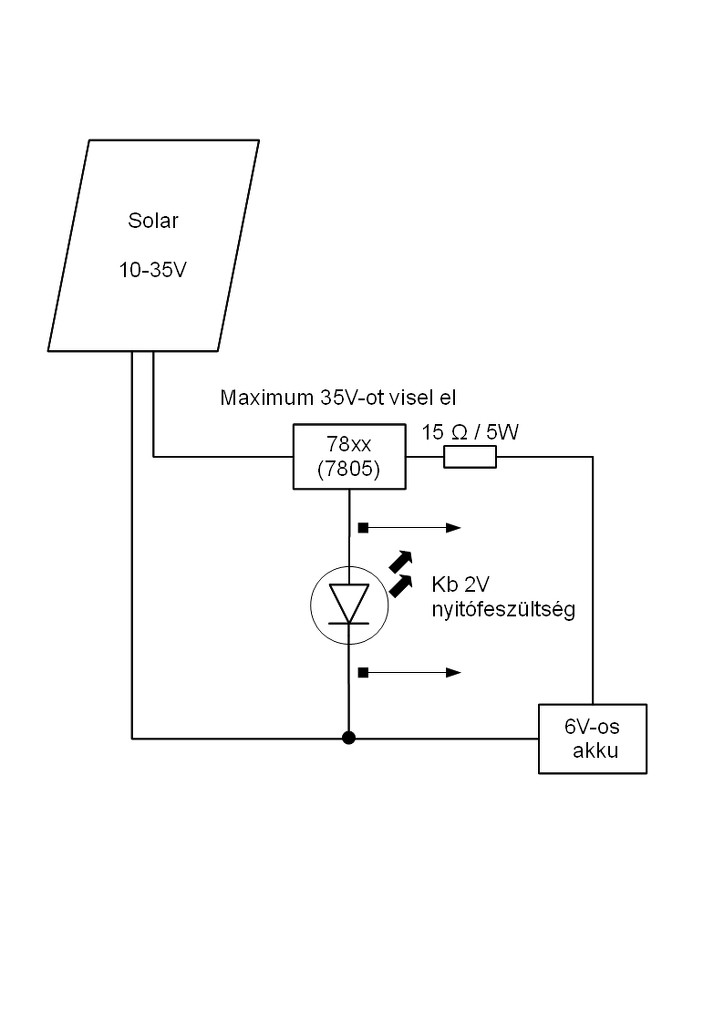 Nem baj, ha nem vagy profi, de ez általános iskolai alap... Ohm törvény... Ha a körben 500mA kell follyon, akkor nyilván ennek megfelelően kell számolnod: R=U/I . Ebből az áram ismert, az ismert tagok: kimenet 6,85V (ólom savas 6V-os akksi töltőfeszültsége), akku belső ellenállása (elvileg ideálisan 0Ohm): ~0Ohm azaz kb rövidzár, ezért kell korlátozni. Így 6,85V/0,5A=13.7Ohm 6,85*0,5A=3,425W . Mivel ilyen nincs a szabvány sorban minden üzletben, vagy csinálsz egyet, vagy kicsivel nagyobb értéket választasz: például 15Ohm/5W . Ez esetben : i=U/R azaz: 6,85V/15=456mA fog folyni a körben, 6,85V*0,456A=3,1236W a teljesítmény ami az ellenálláson diszcipálódik, azaz az 5W-os ellenállásnak bírnia kell. Ha netán kétségeid lennének, vagy zavar a nagy hő, lehet venni 15Ohm/20W TO220-sa tokozatú ellenállást, hűtőzászlóval. Ezt ha elég nagy hűtőfelületre szereled - nos elég hosszú ideig fog szolgálni... Ez a hagyományos áteresztő tranzisztoros megoldás (ez van a stabkockákban is). Ha Stepdown konverterrel csinálod, kisebb a diszcipáció (nem melegszik annyira), magasabb a hatásfok, de több alkatrész kell. Ha nem zavar a hőtermelés, akkor azt hiszem most már össze kell tudnod rakni. Használhatsz persze mást is pld LM317-et, ami beállítható feszültségszabályozó. Úgy rémlik, hogy a földpont csak referencialáb, tehát az üzemi áram nem ezen folyik, azaz az 1N4148, vagy zener, vagy LED is jó, ami kéznél van. Akkor kell csak nagyobb áramú dióda, ha a stabkocka kimenetével sorban kötsz diódát - mert ugye akkor meg 0,5V-ot esik rajta a feszültség, tehát, ha nagyobb a stabkockád, akkor lefelé viheted a feszültségét . Ebben az esetben már azért 1N4001-1N4007 nem árt. Mivel nem tudom milyen diódád lesz kéznél és egy kicsit hőfokfüggő is a nyitófeszültség - nem árt mérni a diódákat. Persze lehet még játszani, mert pld a Schottky diódáknak megint más a nyitófeszültsége és más a germánium diódáknak ...