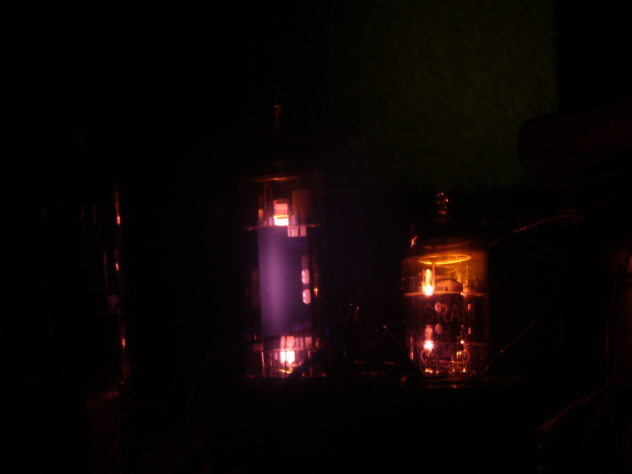 Az uccsó képen viszont tényleg minimális anódizzást sikerült megörökíteni.. a fénykép után megnéztem és tényleg. Hosszabb üzem után kicsit.. alig láthatóan pirul. Az ott a djhans-féle ECC85-EL84 SE , a végcső pironkodik.. Hangban,és sehogyan sem vettem észre eddig.. azaz a fényképig,mert tényleg alig észlelhető minimális. (Bár a fényképen úgy fest szegény,mint aki azonnal le is akarna olvadni) Amúgy nagyon szépen,és hangosan szól! A kapcsoláshoz 250V anódfeszültség van feltüntetve. Nekem ez 290V.. talán ez lesz a hiba. De a cső állapota is "ismeretlen".