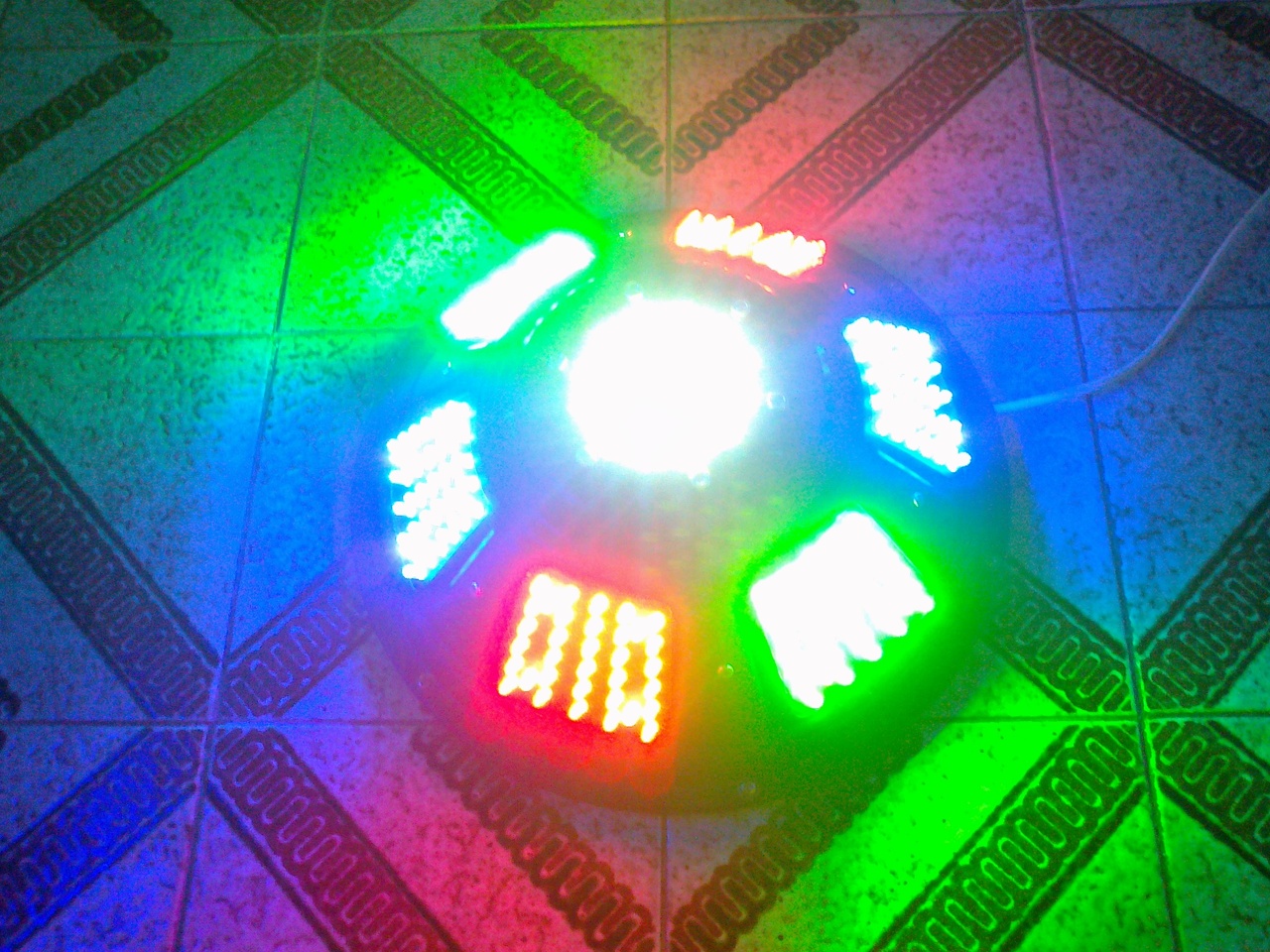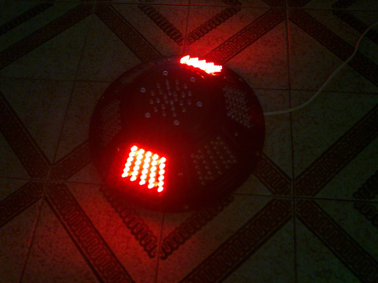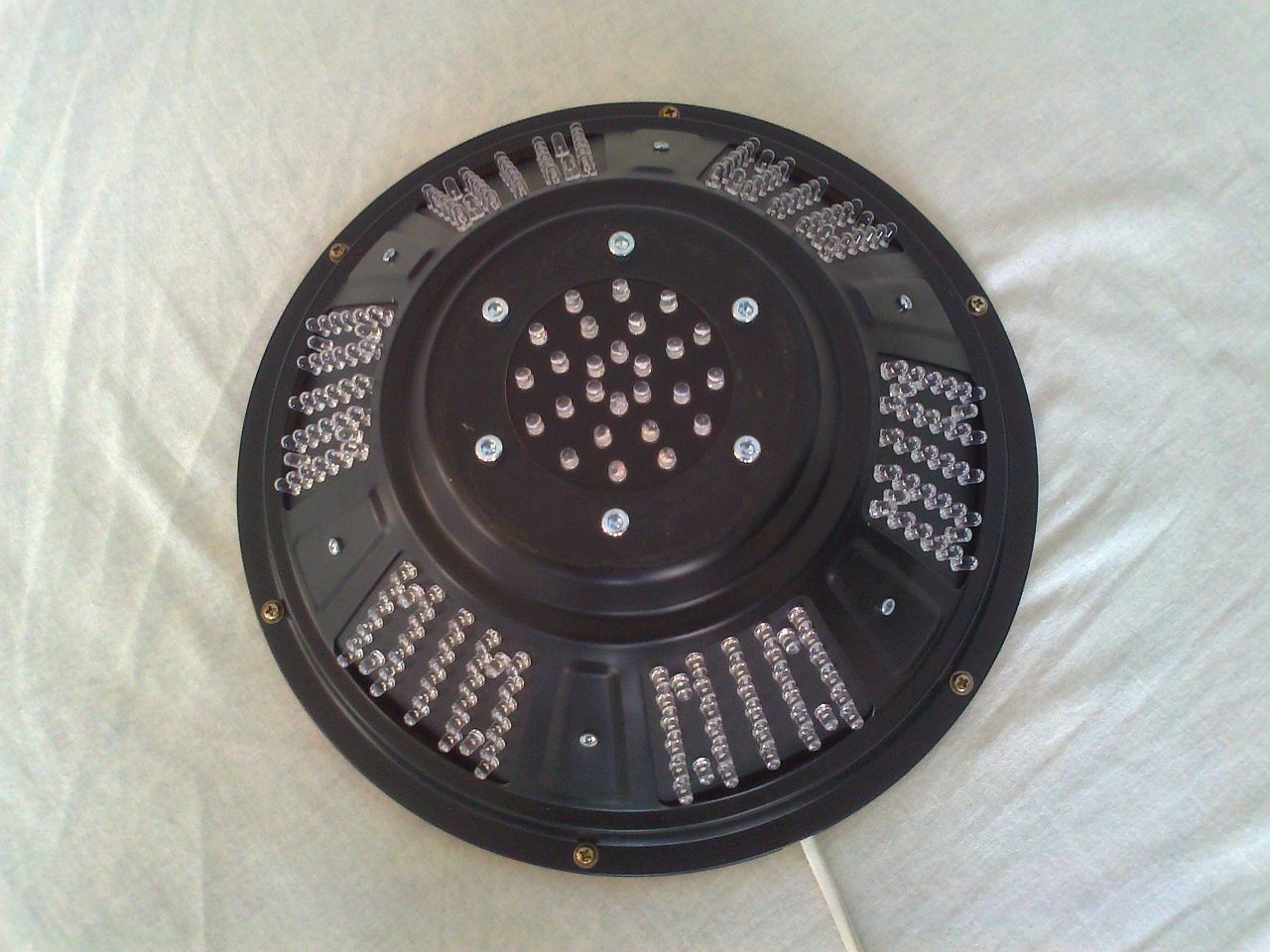 Ma készültem el ezzel a szerkezettel. Egy 12"-os MNC Noir II-es hangszóró kosara lett felhasználva háznak. A LED-eket PIC16F628A mikrovezérlő vezérli, az effektek számát valószínűleg még bővíteni fogom. Még kikapcsolt állapotban is érdekes a kinézete. Működés közben pedig igazán látványos. Elégedett vagyok vele.