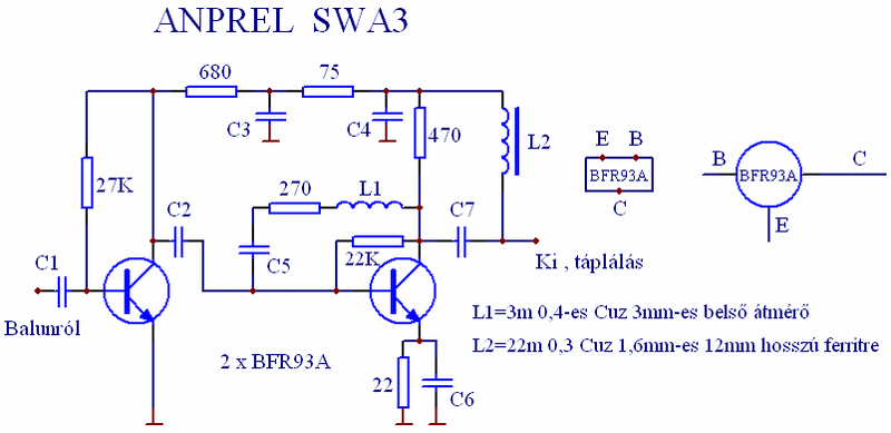 A kondikról: egy kritikus értékű van, a C5 ös. Ez frekvencia kompenzálást, végez, a többi nem kritikus. A C3, C4, C6 szűrő kondok, 1 - 10 nF, a C1, C2, C7 csatolókondi 100 - 500 pF.