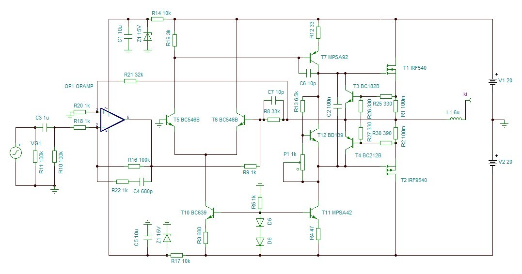 Én tapasztalatból mondom, hogy a -120dB egy durva határ, főleg akkor, ha belső hurok sebessége nagyon nagy, mert akkor az előtorzítás nem viszi TIM-be az egészet. Ennek a kapcsolásnak kb 300V/us a huroksebessége, ami nagyon jó. A TPA6120-ban van hasonló paraméterű hurok, hát jó is nagyon. A probléma az szokott lenni, ha az alacsony torzítás átlagos slew-rate-val párosul, mert olyankor a hangszóró által visszaküldött amperekre reagáló visszacsatolás láthatatlanul TIM-be viszi a kapcsolást. Az is hiba szokott lenni, hogy a visszacsatolás által küldött hibajel amplitúdóban ütközik korlátokba. Ebben a kapcsolásban ez nagyon jó, több mint 600% a tartalék. Szóval nem jó az, ha a hibajel ugyanazon a differenciál erősítőn keletkezik, mint ami a visszacsatolási pont. Ez van szétszedve ebben a kapcsolásban.