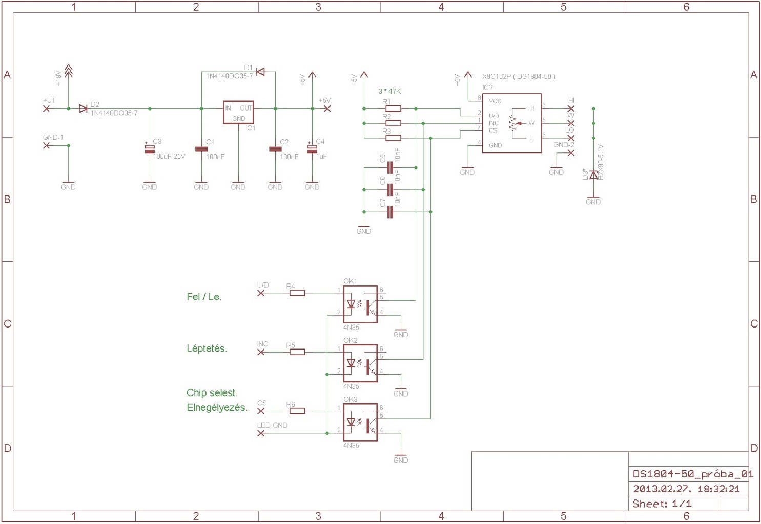 Az optocsatoló csak el szigeteli a törpefeszültségű vezérlő áramkört a hálózattól. Ha sikerül a hagyományos potenciométert digitális áramkörrel kiváltani, akkor az fényerő szabályzása már bármilyen lassú lehet. ( Csak a vezérlő elektronikán múlik, hogy mire lehet még használni... ) Még nem egészen hozza az áramkör azokat a paramétereket amire gondoltam. Bár már működik. Sajnos úgy néz ki, hogy az U2008B tápellátása nem képes feszültséggel ellátni a DS-poti áramkörét a megadott alkatrészekkel. S most nincs kedvem elfüstölni pár IC-t. Jó lenne mellőzni + tápegységet. Mellékelem a DS1804-50 -es áramkör (próba) kapcsolását. Az U2008B áramköre visszább megtalálható. ( Azoknak akik csak most kapcsolódnak bele a témába.) Lehet hogy írtad csak nem figyeltem eléggé! A 20-perces időtartam nem lenne elég? Mert ha igen, akkor nekiállok tesztelni az FC0102-es áramkört.