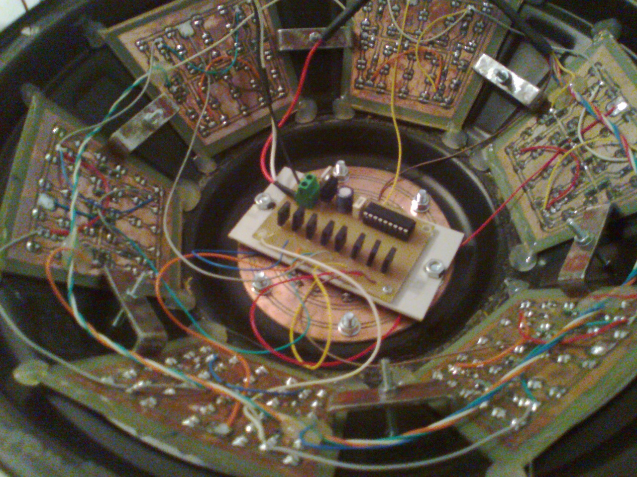 Összesen 230 db LED van benne. Egy 12V-os, 2A-es kapcs. táp hajtja. A belseje kicsit kusza, de még nem végleges. Jelenleg csak a PIC programja alapján üzemel, de majd szeretném kiegészíteni hangvezérléssel, úgy még jobb lenne.