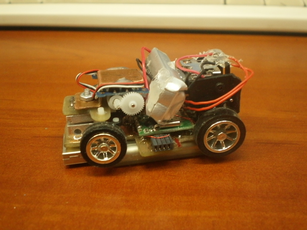 Azt hiszem, ismeritek azokat a kis kinai vacakokat, amiket 2e-ert dobnak az ember utan atlatszo szirenaburaban. A meret egeszen jonak tunt ahhoz, hogy a ket kisfiammal (7 es 4) a hideg teli napokon az asztalon vagy a padlon palyakat epitsunk es versenyezzunk, de a jatek menettulajdonsagai nem tettek lehetove ezt. Raadasul az iranyitasa nagyon primitiv volt (total jobb-egyenes-total bal), sebessegszabalyozasa meg nem volt egyaltalan (elore max - all -hatra max). Noch dazu 3db 27MHz-est kaptam... Ezert elhataroztam, hogy atepitem, minel tobb dolgot meg szerettem volna tartani az eredetibol. Ez annyiban sikerult, hogy a kerekek megmaradtak. Eloszor is uj alvazat kaptak NYAK lapbol, uj PIC-es elektronikat, 2.4GHz-es taviranyitast. Teljesen sajat taviranyito kodolast, hidvezerlest kapott a motor, a kormany meg egy prinyo, 1.7g-os miniatur szervot, ezt is jocskan at kellett epiteni. A hajtasat egyelore egy 120mAh-s LiPo helikopterakksi biztositja. Az ado egyelore szinten heliakksival megy, dobozolasa egy regi akkus furo lett, igyekeztem a hivatalos pisztolyformat utanozni. Esztetikumra nem adtam tul sokat. Telemetriasra terveztem, hogy tudja jelezni a kisauto elemfeszet. Elvileg van rajta csati egy LCD-nek is. Csak a fantazia szab hatart, hogy mi legyen rajta, mivel minden sajat tervezes, kivitelezes, programozas. Mivel bicegett kanyarodaskor, az elso felfuggesztes kapott egy hajszalvekony acelszalbol tekercselt rugot. Az elso peldany 14K22-es PIC-el ment, az ujabb verzio mar 25K80-ast hasznal. A kormanyzas es a hidvezerles is szoftveres PWM (tudom, hogy a PIC-ben van vagy 5db hardveres PWM, de igy szerettem volna megcsinalni) Az eredeti hajtas tul gyors volt, ezert kaptak jopar plusz attetelt, a masodik modell pedig egy pici szervo hajtasat kapta meg. A rajz szandekosan aszimmetrikus, mert az egyik oldali kereken van egy fogaskerek, a masikon pedig egy hosszabb nyakresz. Ugy terveztem, hogy mindenfele kartonpapir-rampakkal meg jatekkocka-alagutakkal, vonalzo-hidakkal tesszuk majd erdekesebbe a dolgot, hogy novekedjen a gyerekek kreativitasa. Szerencsere a 2.4-es adovevonek integralt antennaja van, tehat ahol a kasztni elmegy, ott az antenna nem akad be - Alkatresz gyakorlatilag beszerezhetetlen hozza, minden en csinalok sargarezbol meg muanyag ora-fogaskerekekbol es a fellelheto hulladekokbol. A masik nagy ellenseg a merete miatt a hosszu noi hajszal. proci: 18F25K80 a taviranyitoban es a kisautoban is adovevo: RFM70 aramforras: 1S LiPo a taviranyitoban es a kisautoban is meghajtas: Turnigy 1440-es kis szervo jelentosen atalakitva kormany: sub-nano servo, atalakitas nelkul A hozzászólás módosítva: Márc 1, 2013