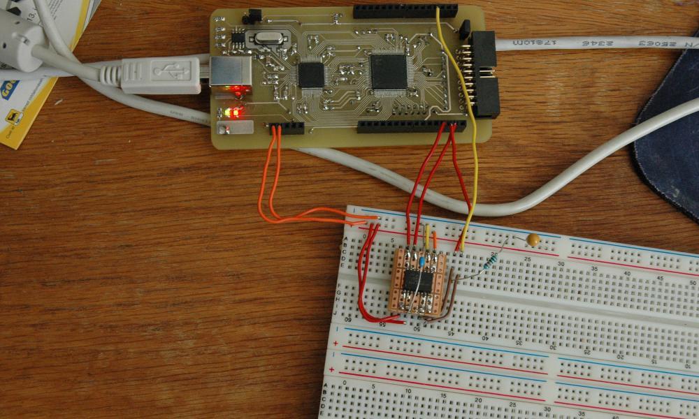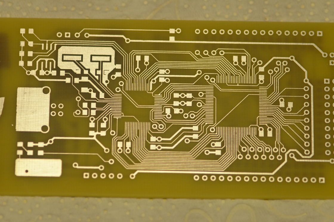 A koncepciót innen vettem: Bővebben: Link, csak kicsit megvariáltam. Az FT2232 adja a kapcsolatot a PC felé, a CPLD pedig szintillesztőként és bufferként tud funkcionálni, pluszban mindenféle logikai kapcsolatokra felprogramozható, amivel más FT2232-alapú hasonló eszközöket tud emulálni, így megkönnyítendő a különféle programokkal való kompatibilitást. Mivel az FT2232 összesen 2x16 vonalat tud, ezért egy 2x32-es CPLD-t raktam mellé, az összes vezetékét ki lehetett vezetni, így nem csak JTAG illesztőnek lehet használni, hanem bármilyen funkciót ki lehet belőle csikarni, amit az FT2232 tud. Délután meg is volt az első teszt, egy TP-Link routerből kioperált 8MB-os soros flasht kellett újraírni, mivel a tulajdonos sikeresen rátöltött egy nem odavaló firmware-t. Készült a SOIC chipnek szép kis adapterpanel... ![]() Egyébként nem elsőre sikeredett így a készülék, először a kedvenc módszeremmel (öntapadós etikettek hordozólapjával) próbálkoztam, de az nem igazán bírja a nagyobb egybefüggő területeket, a nitrohigitó "nem hatotta meg", a Label-off pedig elmaszatolta a rajzolatot. Kipróbáltam műnyomó papírral is, ott a Label-off működött és csodákat tett. Viszont míg a hordozópapír tökéletesen lejön, a műnyomópapír nem. Egyesek szerint nem baj, ha a rajta marad egy kevés papír, majd maratás közben leázik. A mellékelt ábra szerint ez így van, a gond az, hogy sokára ázik le, ezért ahol sűrű vékony vonalak mennek egymás mellett, ott maradtak pöttyök, és pont ezek voltak azok a helyek, ahol a papír maradványai ottmaradtak. Ezek a pöttyök csak nem akartak eltűnni, miközben a maradék része a panelnek már régen kész volt, és nem akartam kockáztatni, hogy alámarjon/levigye a tonert is máshol. Na ezen a technológián még kéne kicsit javítani, de szerencsére így is működik a végeredmény.