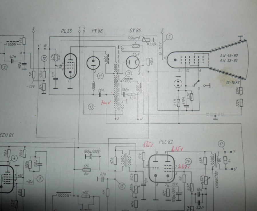 Az a 4,7 kiloohm a PL36 segédrácsán van. A cső nem izzik? Esetleg kondizárlat? Valószínűleg ez a zárlat söntöli a csövek fűtését is. Mindenesetre közlöm a rajzokat, ha nem lennének meg.