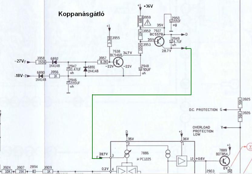 Egy dolgot nem értek: eredetileg biztosan nem csattant, legalábbis ekkorát nem. Tényleg elég gázos. A leírásban benne van hogy koppanásgátló áramkör van benne. Mi nem működik? A leírás a két előfok ict említi: "IC7860, 7886, 3as láb, 2949 kondi, ez a rész bekapcskor. Dióda 6892, tranzisztor 7938, 7937, ellenállás és a két előfok, ez játszik szerepet kikapcskor.