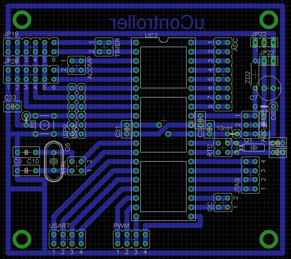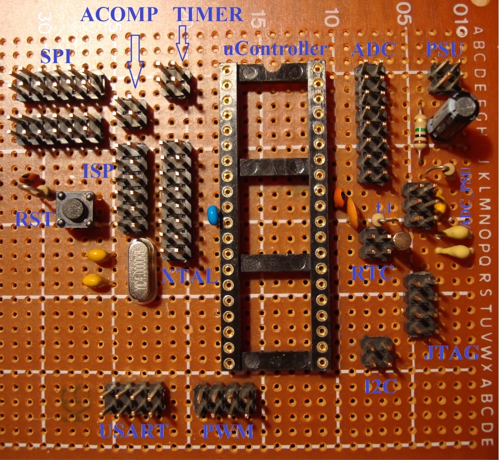 A NYÁK rajzot EAGLE programmal készítettem alap 0,05 colos négyzethálóval, ahol a vezetősávok 0,056-osak. Ha jól gondolom akkor ezek nagyobbak a 40miles-nél. (most meg is néztem a programban, tehát ha jól értem 0,05 col vagy inch az = 50 miles) Azért használtam ezt a méretet, mivel úgy tervezem, hogy műnyomós technikával készíteném el majd a panelt, ami ha jól tudom "kicsi" vezetősáv szélességen nem biztos, hogy jó lesz. A próbapanelt csak azért raktam így össze, forrasztás nélkül, hogy látható legyen, hogy hol tudnék szalagkábelt is használni, mint pl.: ISP, SPI, JTAG.... Így ki tudtam próbálni, hogy ne ütközzön bele a csati egyik a másikba, vagy kondiba. Szóval ezt nem fogom teljesen összerakni és légkábelezni. Ezt a panelt azért szeretném megépíteni, mert a nagy próbapanelem már kevés a hely és a sok vezeték amit használok zavar nem is beszélve az egyre gyakoribb kontakt hibákról. Tehát, hogy átláthatóbb legyen. Még 2 kérdésem lenne, hogy a ADC VCC-jébe ha jól tudom érdemes lenne egy ~10mH-s induktivitást betenni, ami így jobban szűri a zajt, jól tudom? A másik, hogy nem feltétlen kell, de egyes AVR reviziókhoz(hibás szériákhoz) a TOSC lábakra azaz a RTC kristályhoz néha kellhetnek kondik? Szóval hogy az induktivitásnak és az említett kondiknak csak foglalatokat ültessek a NYÁKba? SB