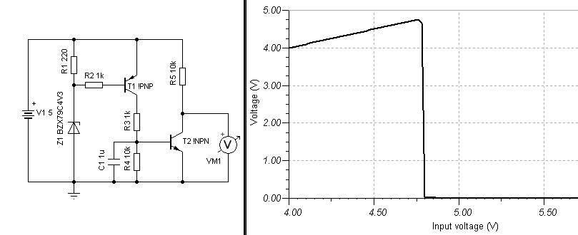 Szeretnék késziteni egy pnp tranzisztoros kapcsolást. A lényege, hogy ha a tápfesz eléri a kívánt szintet, kapcsoljon. Majd inditson el egy időzítő áramkört. Ugy képzelem, hogy a pnp tranzisztor bázisát egy zener diodával megemelem, a zener és a bázis feszültség összegénél kinyit a tranzisztor, majd kapcsolja a következő fokozatot. Megépítettem, de nem helyesen működik(szimulátorban sem jó), sajnos nincs scopom sem, hogy megnézzem a jeleket. Mi lehet a hiba?