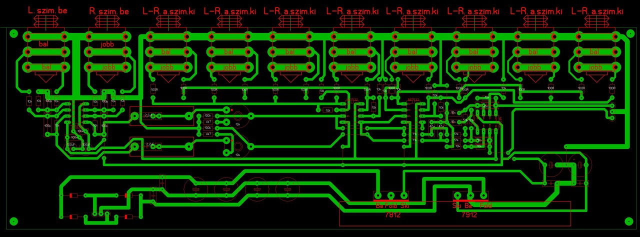 Látom a terv központi eleme az IC-k tápvezetése. Ne azt forszírozd! A legrövidebb jel utakra kéne törekedni. Az asszimetrizálót egészen a csatlakozók tövébe tenném és szorosan mellé a másik 3 IC-t. Ennek Kokozo fórumtárs a nagymestere, minimum harmadára csökkentené a NYÁK-ot, de már a felére tömörítés is jelentősen javítaná a zavarérzékenységet. Ne maradjon el a 100µF tápszűrés minden egyes IC-nél, mert ennyi műveleti erősítő roppant könnyen oszcillátorrá válik.