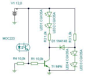 Sajnos a mai napig nem találtam jól működő megoldást arra, hogyan lehetne a relét lecserélni tranzisztorokra. A feladat az, hogy a 16 V-os váltakozó áramú jel az optokapun keresztül (a váltóáramú részről galvanikusan leválasztva) működtessen két-két LED-et attól függően, hogy van-e bejövő jel vagy nincs.